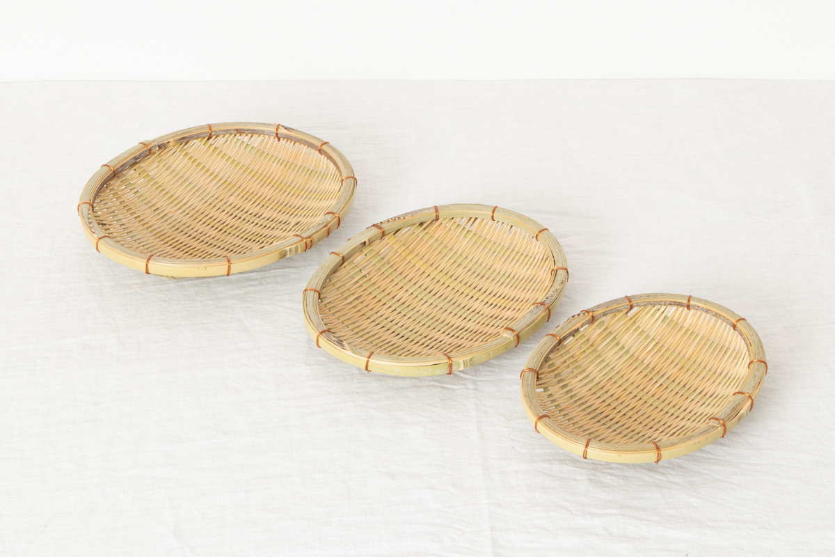 機械を使わず、一本一本のひごをナタと手で仕立て、がっちりと編み上げられたざるは、力強く、それでいて美しい。