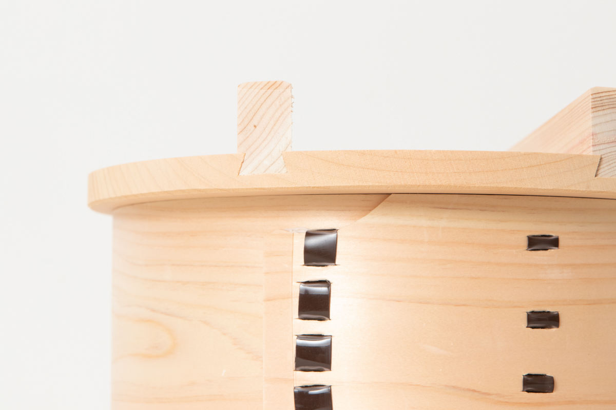 A handai is made by arranging thin, rectangular staves of Sawara cypress into a circle, then securing them with a bamboo hoop. A round bottom board is inserted at the end to complete the tub.Unlike round containers such as steamers or bento boxes—types of bentwoodware made by bending a single thin board into shape—tubs like the handai are constructed differently. The staves are set upright side by side, and the bamboo hoop (taga) is tightened around them by tapping it with a wooden mallet.Some wooden tubs are reinforced with copper hoops instead of bamboo. Copper hoops are typically tightened using specialized machinery, whereas bamboo hoops are entirely handcrafted—including the hoop fitting itself—making the tub more elaborate and refined.Furthermore, every step in the making of this handai—from shaving the staves to selecting bamboo and weaving the hoop—is skillfully carried out from start to finish by a single artisan.The bamboo hoop is woven in advance and then fitted onto the wooden tub, which requires a high level of skill and experience to match each size precisely. The tightness of the hoop must be carefully adjusted based on the artisan’s intuition and a sense of how the wood will expand or shrink over time.You may notice marks or small dents on the wooden tub or bamboo hoop—these are traces from the wooden mallet used during assembly and are a natural result of the handmade process. We intentionally leave these hammer marks as sanding them down would roughen the surrounding surface of the wood. Please understand that they are not defects.There may also be a small circular mark at the center of the base, as seen in the photo. This is a standard result of the process used to shape the bottom board and is also part of normal specifications.This is the rim. It is smoothly polished for a gentle and comfortable feel in the hand.Sawara wood does not easily conduct heat, so even when freshly cooked rice is placed inside, you can safely touch the tub with bare hands.This is the underside of the handai.Please note that this tub is not designed to hold water. If filled with water, some leakage may occur.The wood grain is beautifully clear and draws the eye with its quiet depth.The handai is sold separately. Matching lids are also available for each size.The lids are also made of Sawara cypress. They are designed to rest on the rim of the handai. Because natural materials are used, you may notice knots in the wood. This may result in slight indentations or irregularities, but these do not affect use and are not considered defects.Depending on the time of arrival, the lid knob may not be the rounded “kamaboko” shape but a square type as shown in the photo (photo: Mini Japanese Steamer).We will deliver whichever type is available at the time of arrival.Please note that the type cannot be selected.