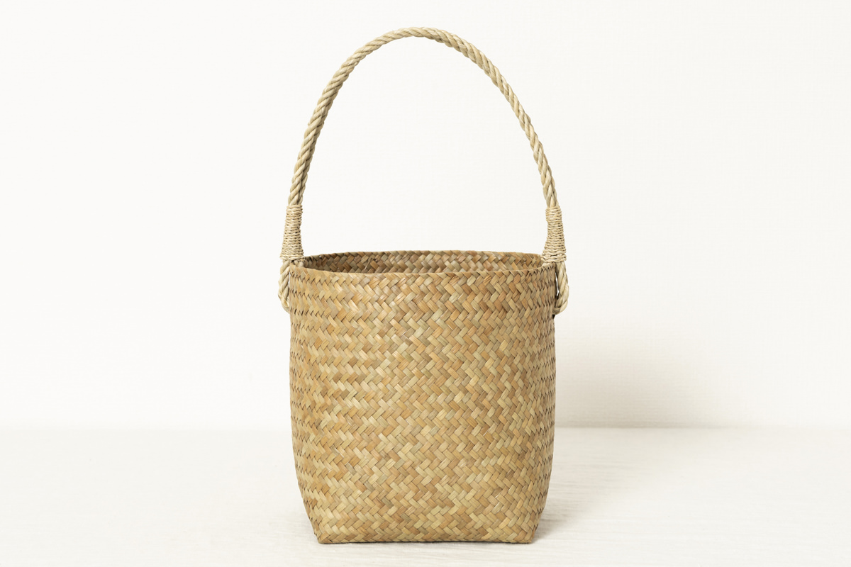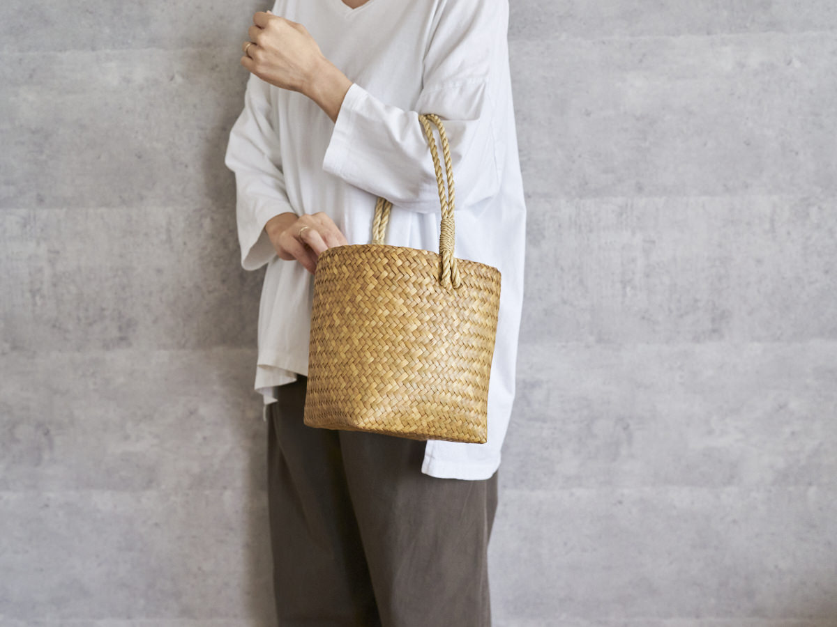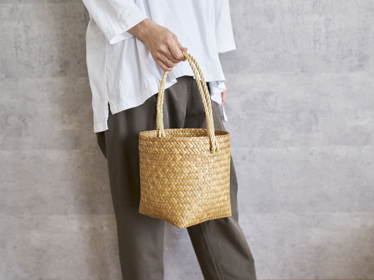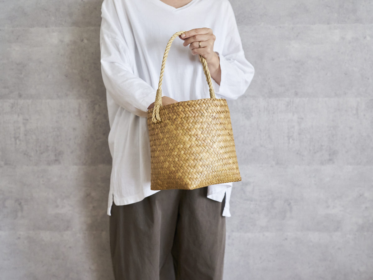 こちらの「バケツ」型バッグは、底面をほぼ正方形に整え、カチューの素材を無理なくかたちづくりながら、自然に口元まで編み上げているのが特徴です。