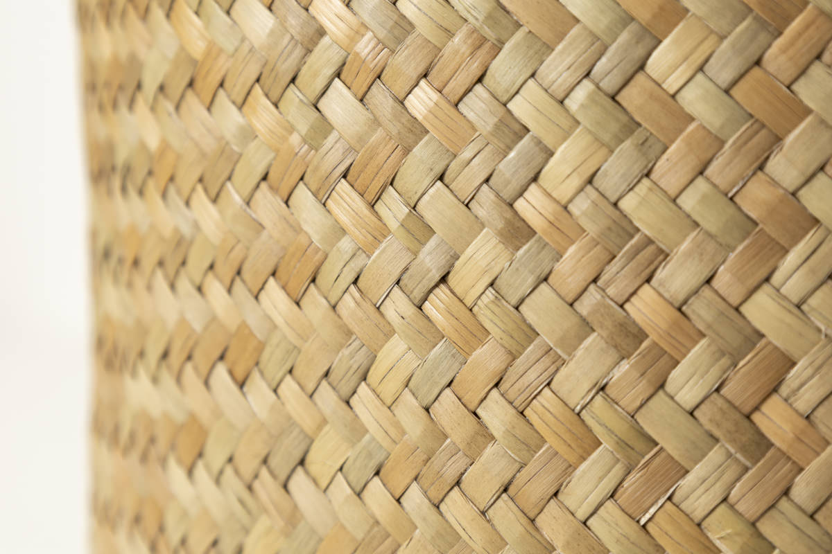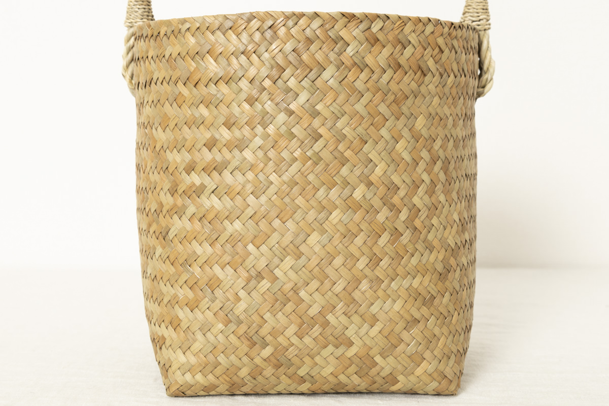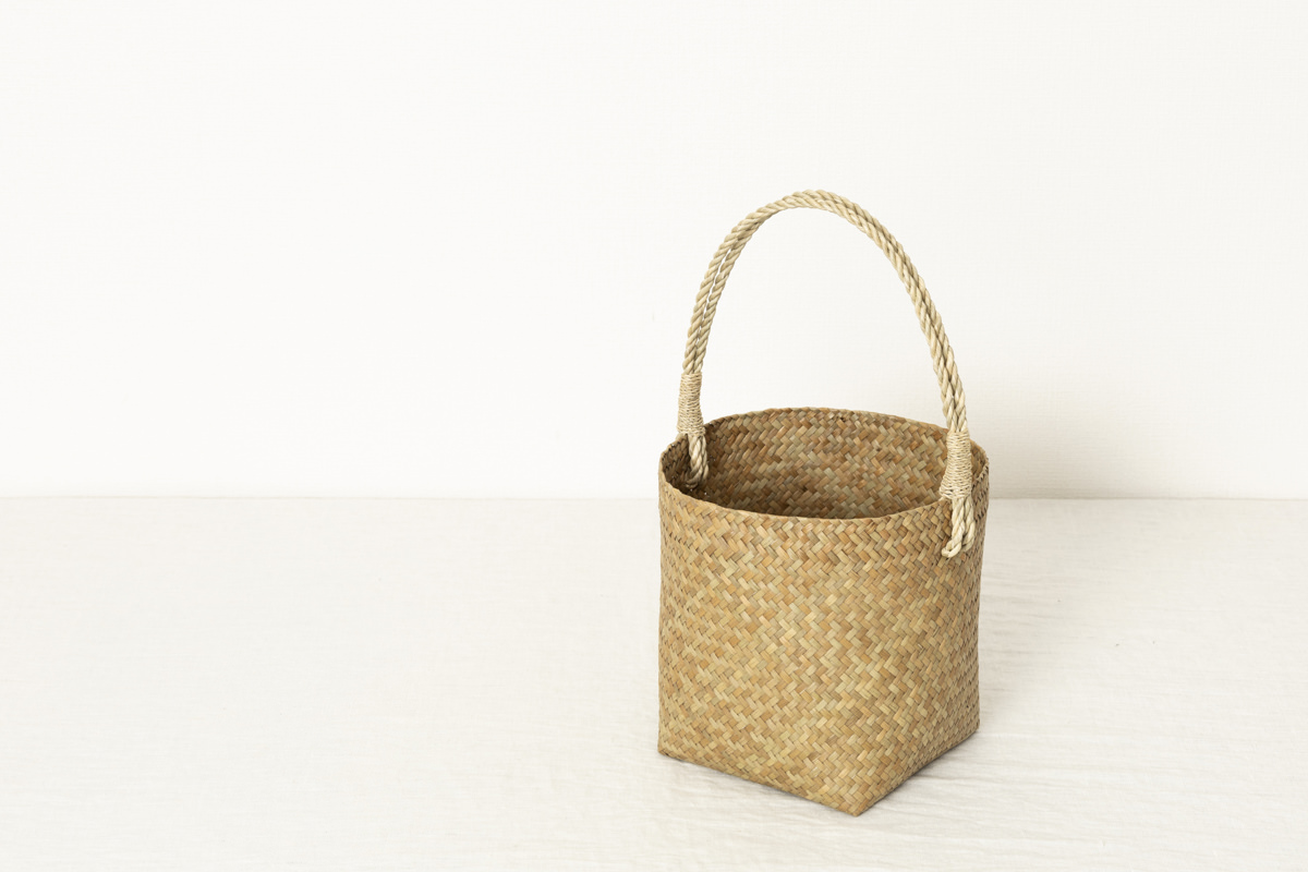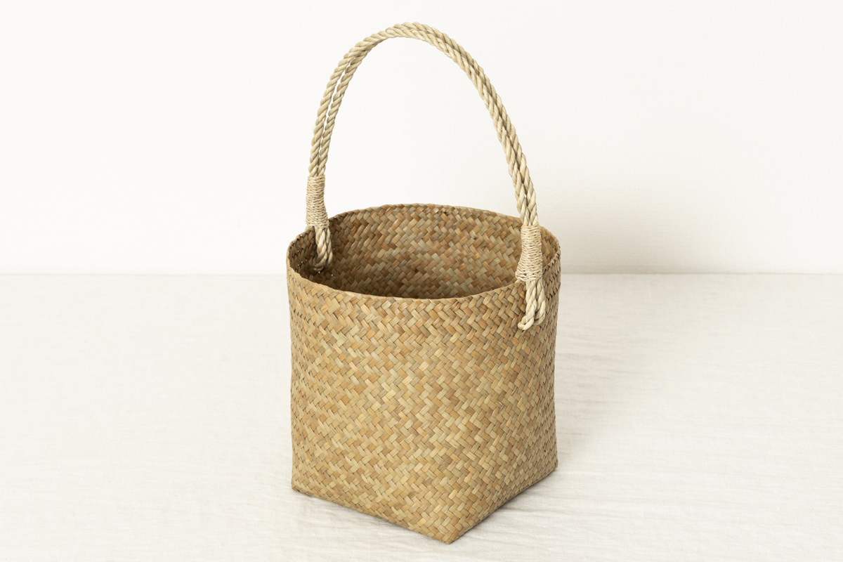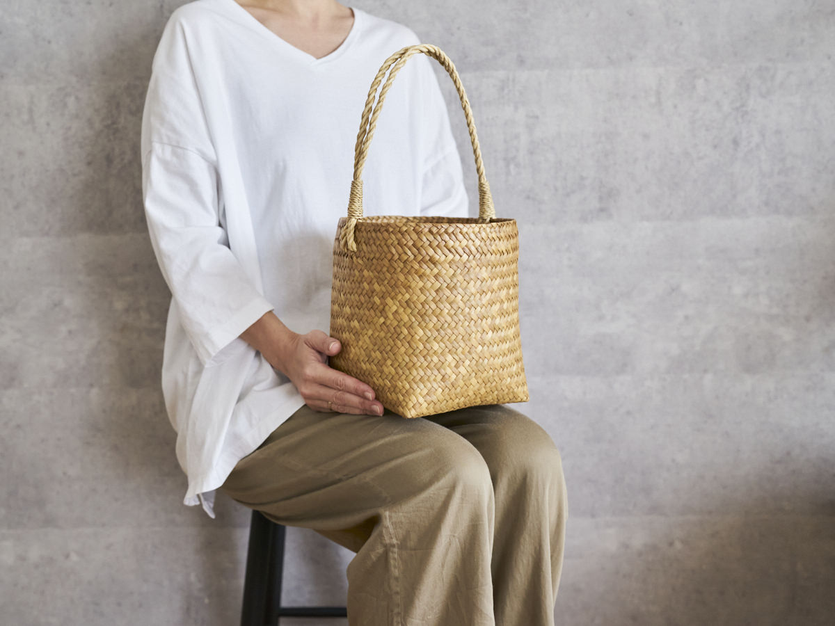 こちらの「バケツ」型バッグは、底面をほぼ正方形に整え、カチューの素材を無理なくかたちづくりながら、自然に口元まで編み上げているのが特徴です。