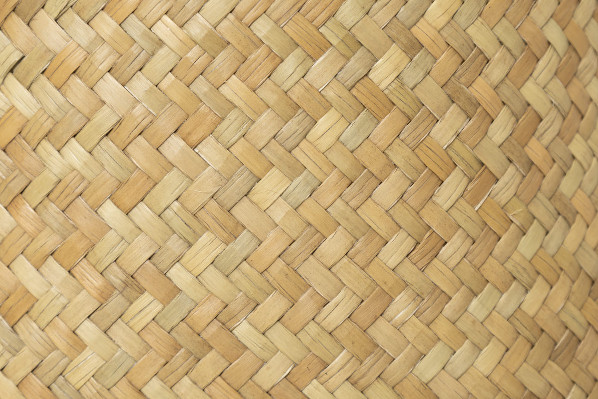 かごは、カチューという草の、茎のところを根から切りとり、乾燥させて平たくしたものを編みこんで作られます。