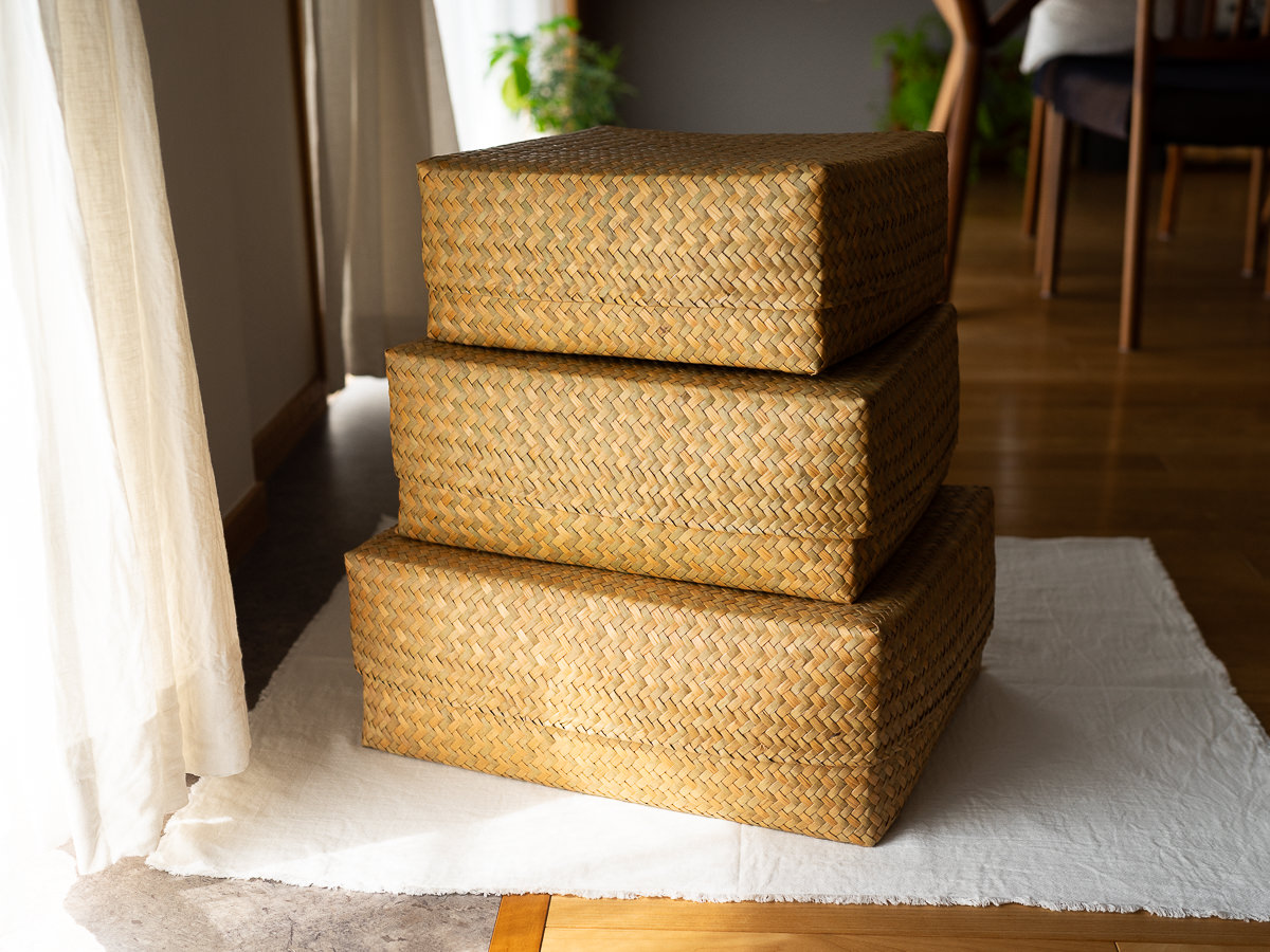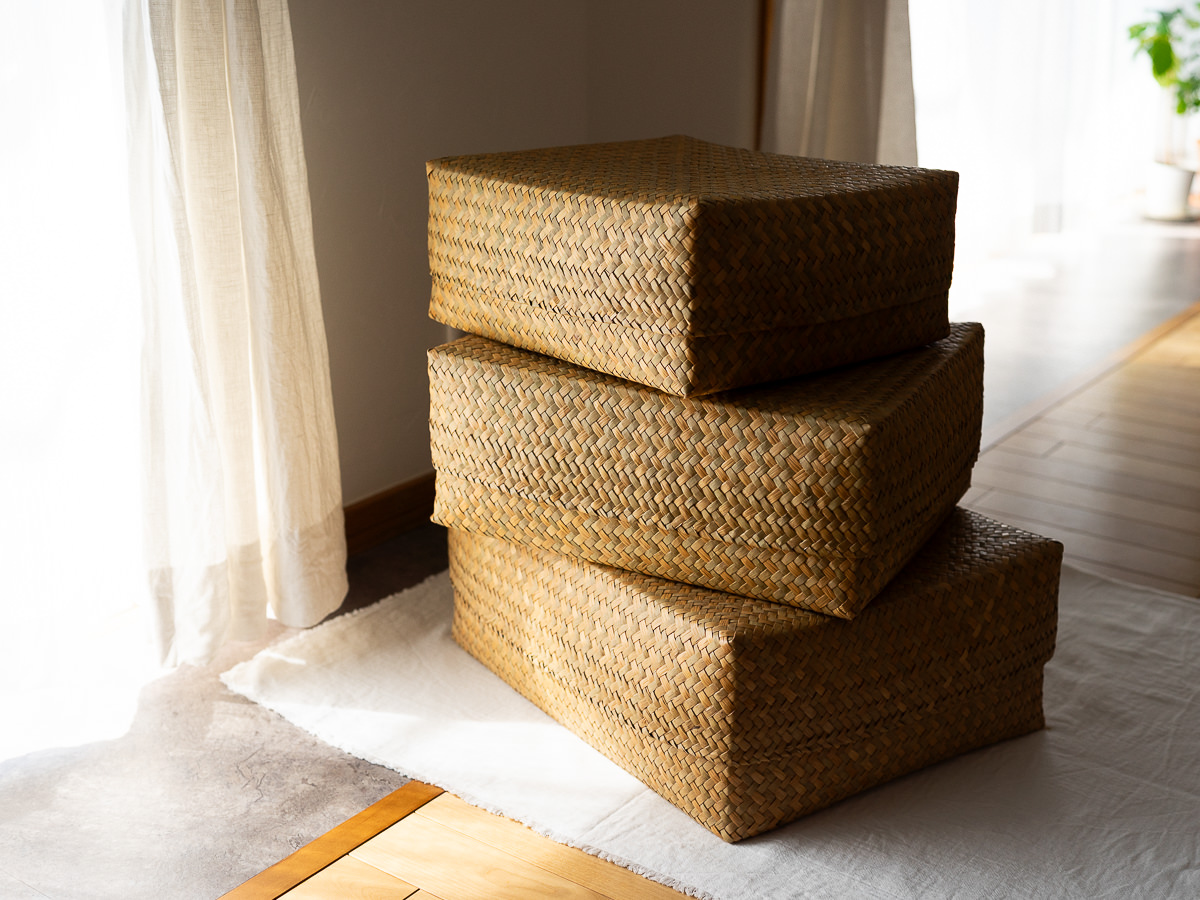 大きな蓋つきのかご、積み重ねてある姿も可愛らしく思えます。