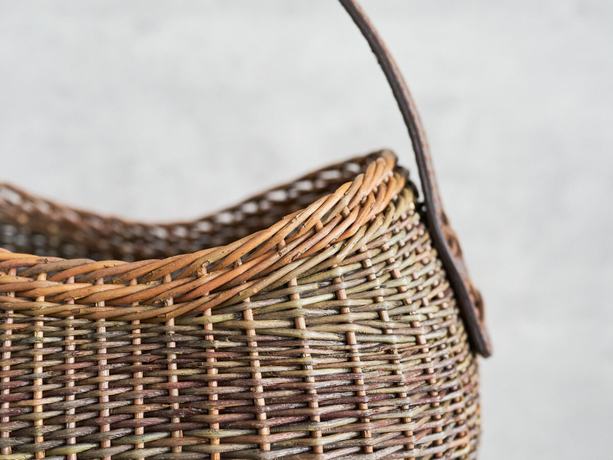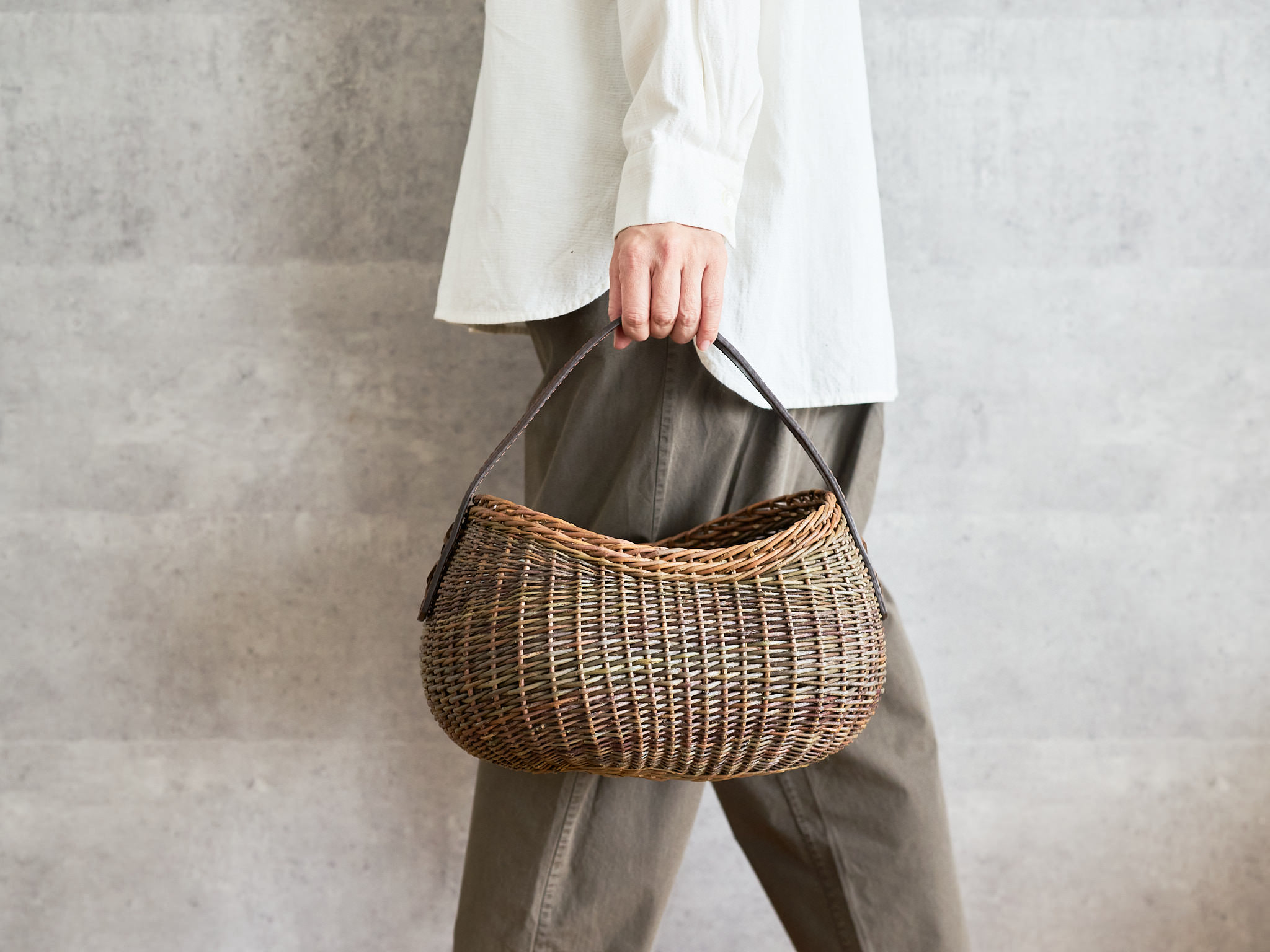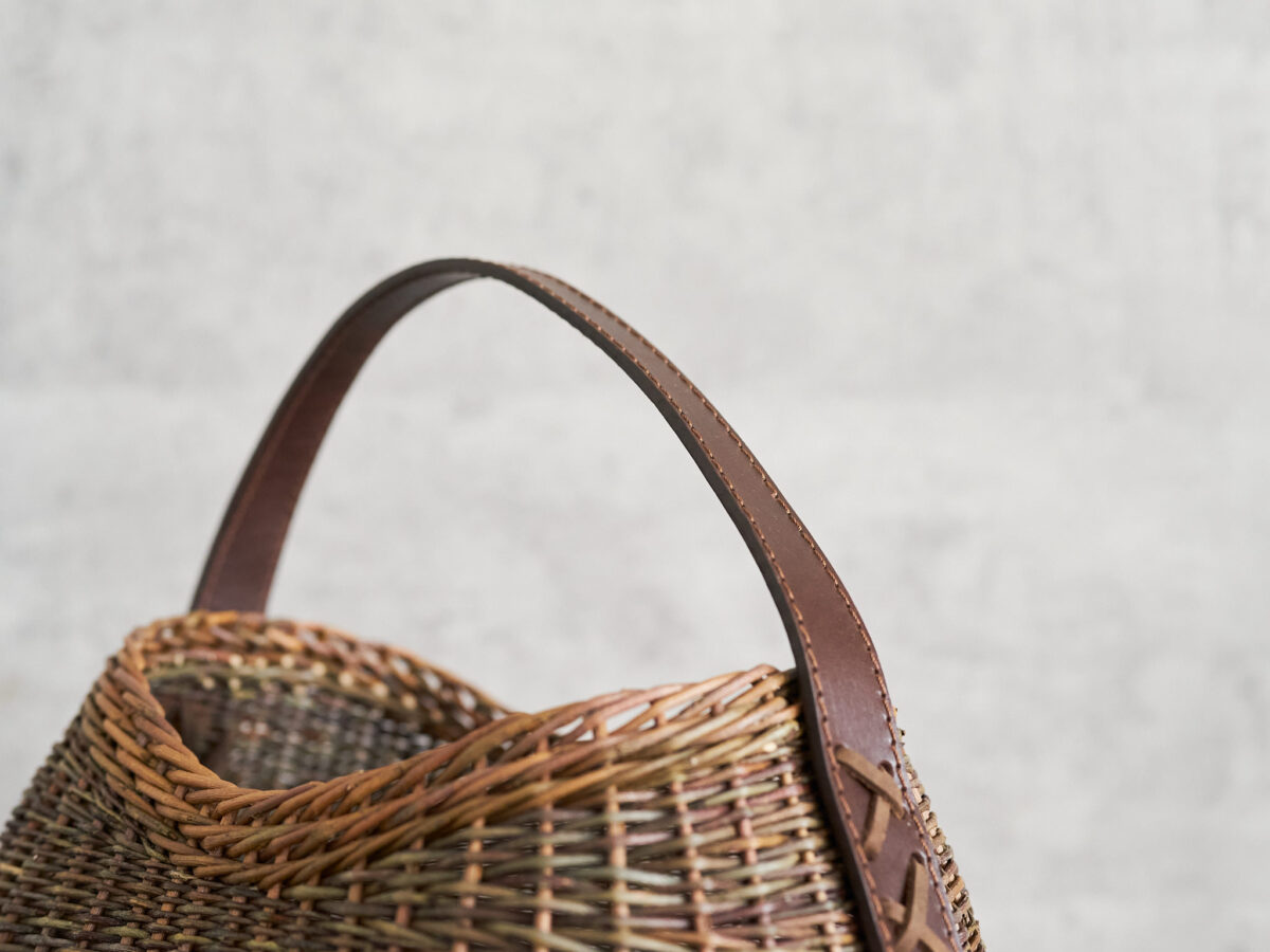 かごの持ち手には、厚みのある皮が使われています。やなぎで作られたハンドルに比べると、皮はしなやかにかたちが馴染むため、手にも持ちやすく、使い勝手のよい作りです。