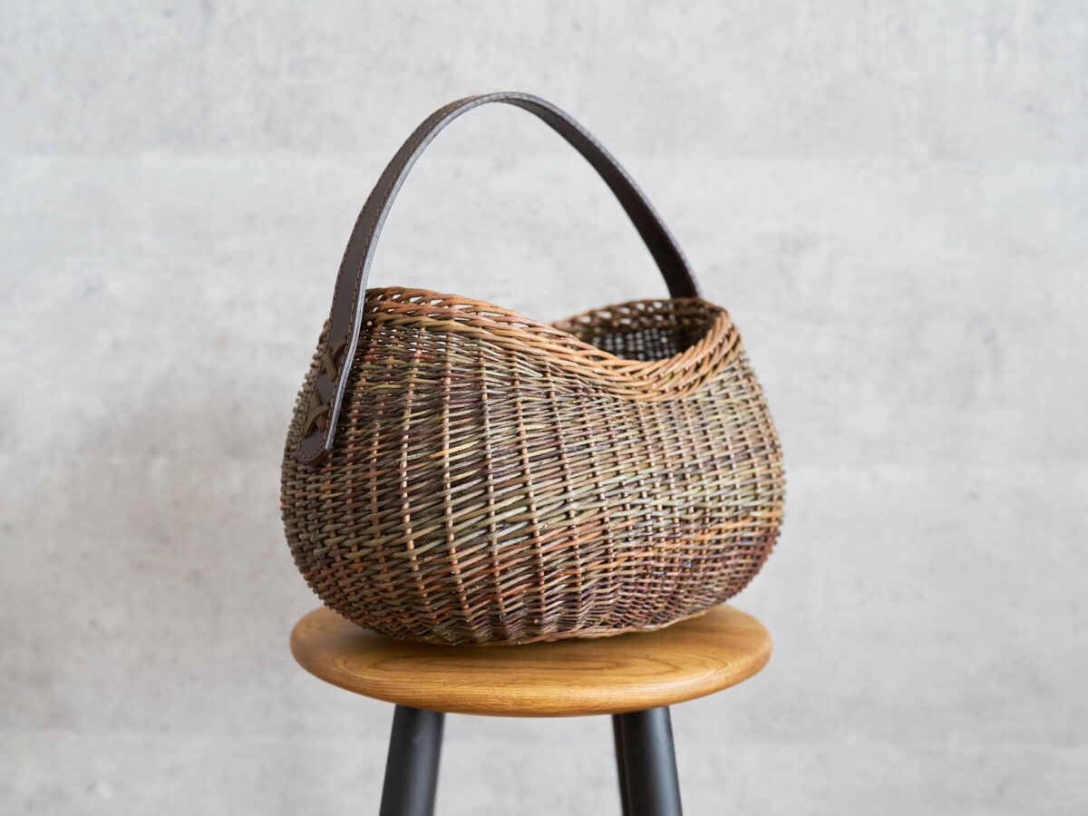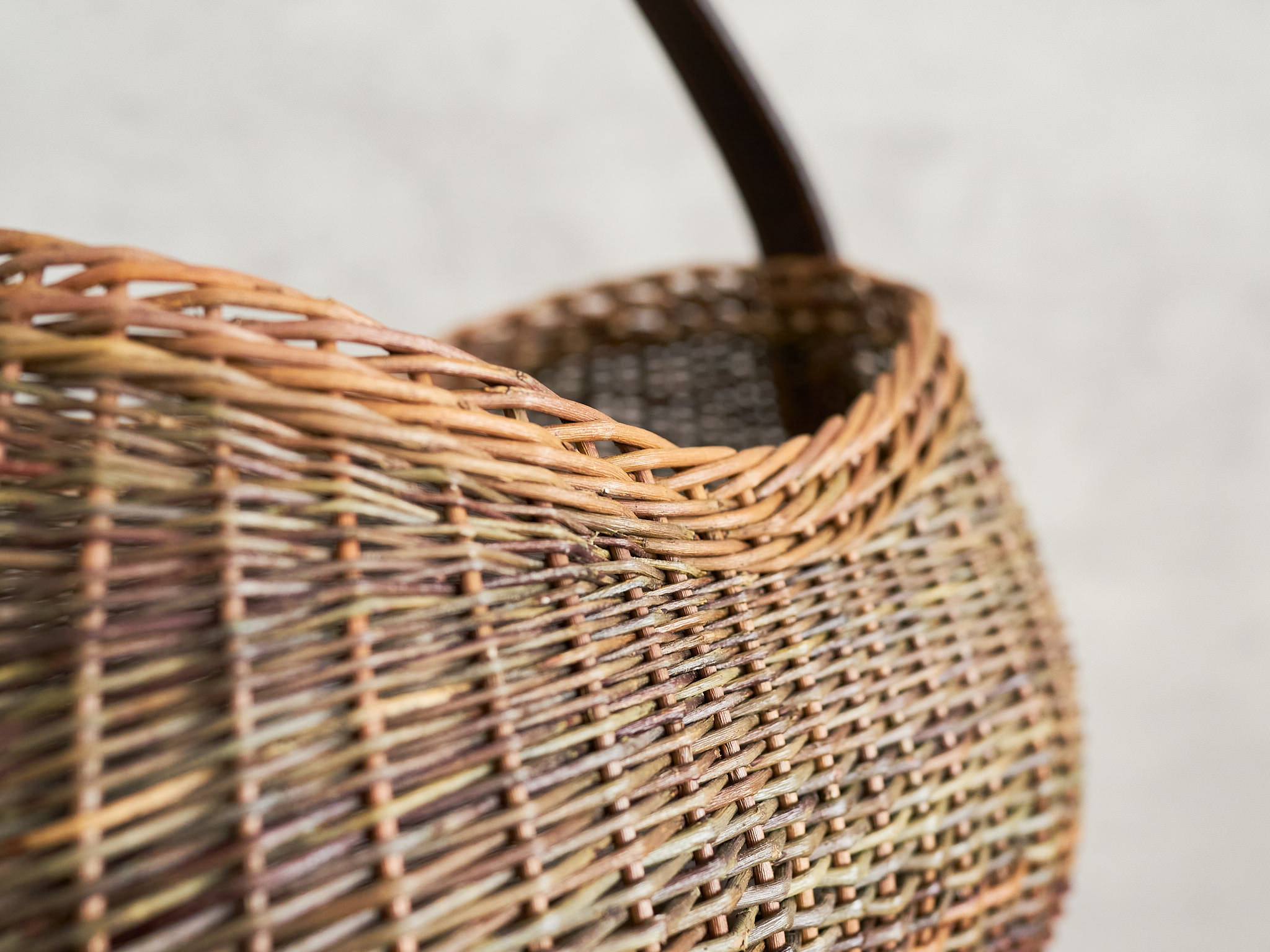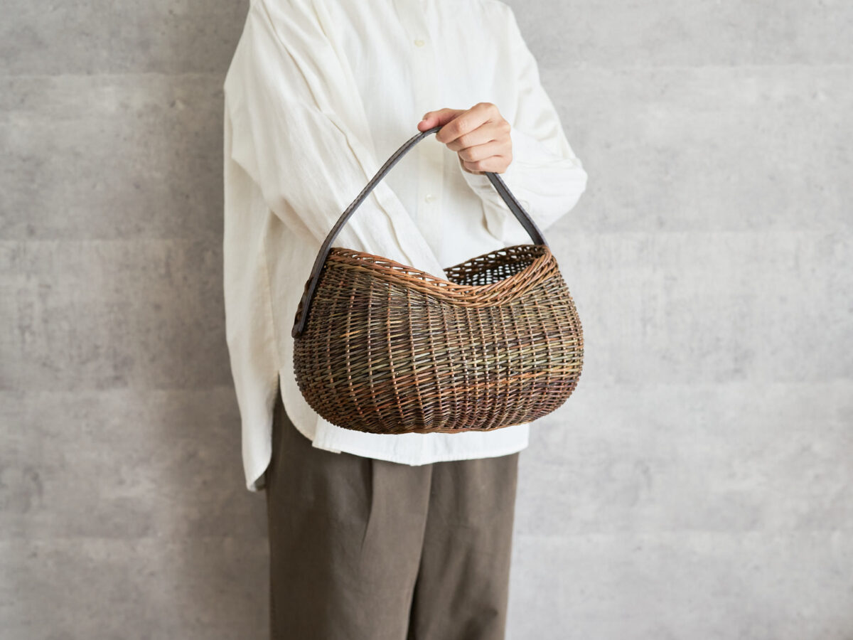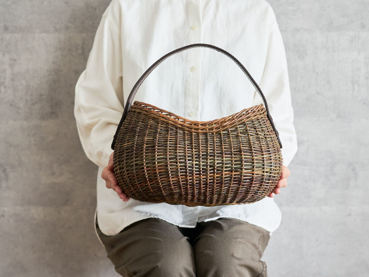 かごの持ち手には、厚みのある皮が使われています。やなぎで作られたハンドルに比べると、皮はしなやかにかたちが馴染むため、手にも持ちやすく、使い勝手のよい作りです。