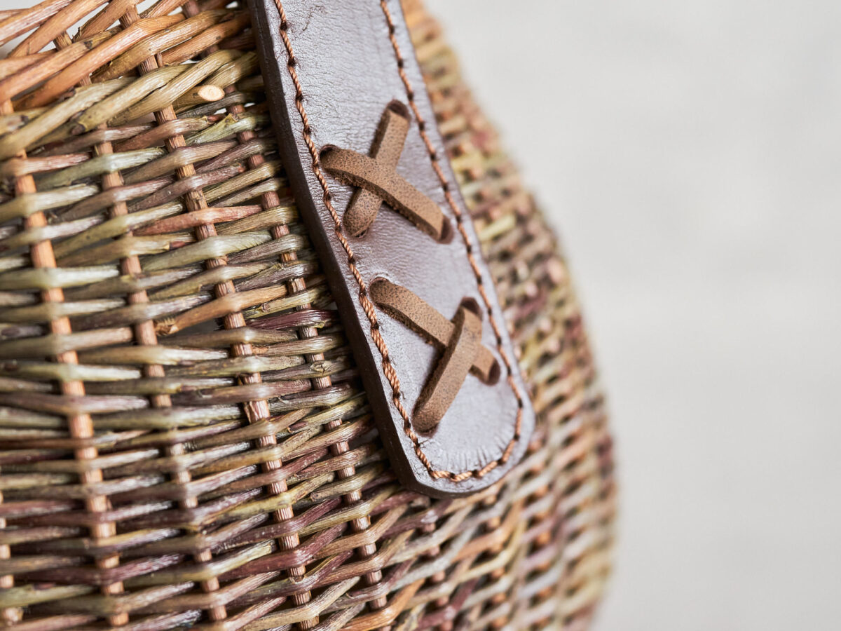 かごと持ち手は、こちらも皮で縫いとめられています。遊び心のあるステッチが、よいアクセントになっています。