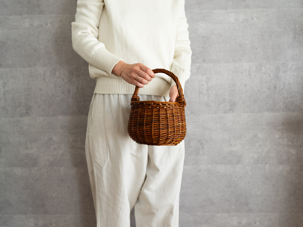 やなぎのみを使って、かご部分も持ち手も仕上げられています。どちらのサイズもところどころ、やなぎの固い「芽」がありますので、指や衣類を引っかけて傷めないよう、お気をつけください。