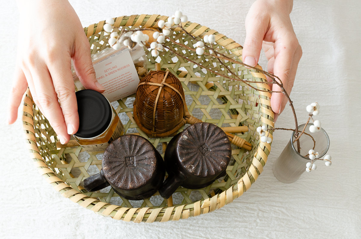 楕円の中サイズに、小さなカップと茶漉しや茶葉などを入れてお茶セットにしてみました。