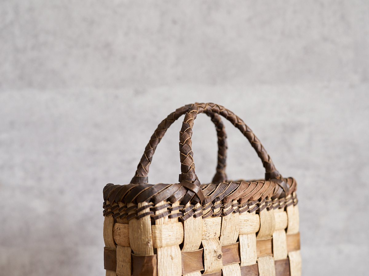 かごの持ち手部分です。持ち手もこげ茶色の裏皮が見えるように編まれています。持ち手の芯材として、あけび蔓が入っています。芯材は、くるみの樹皮で編み上げ、かご部分に留められています。