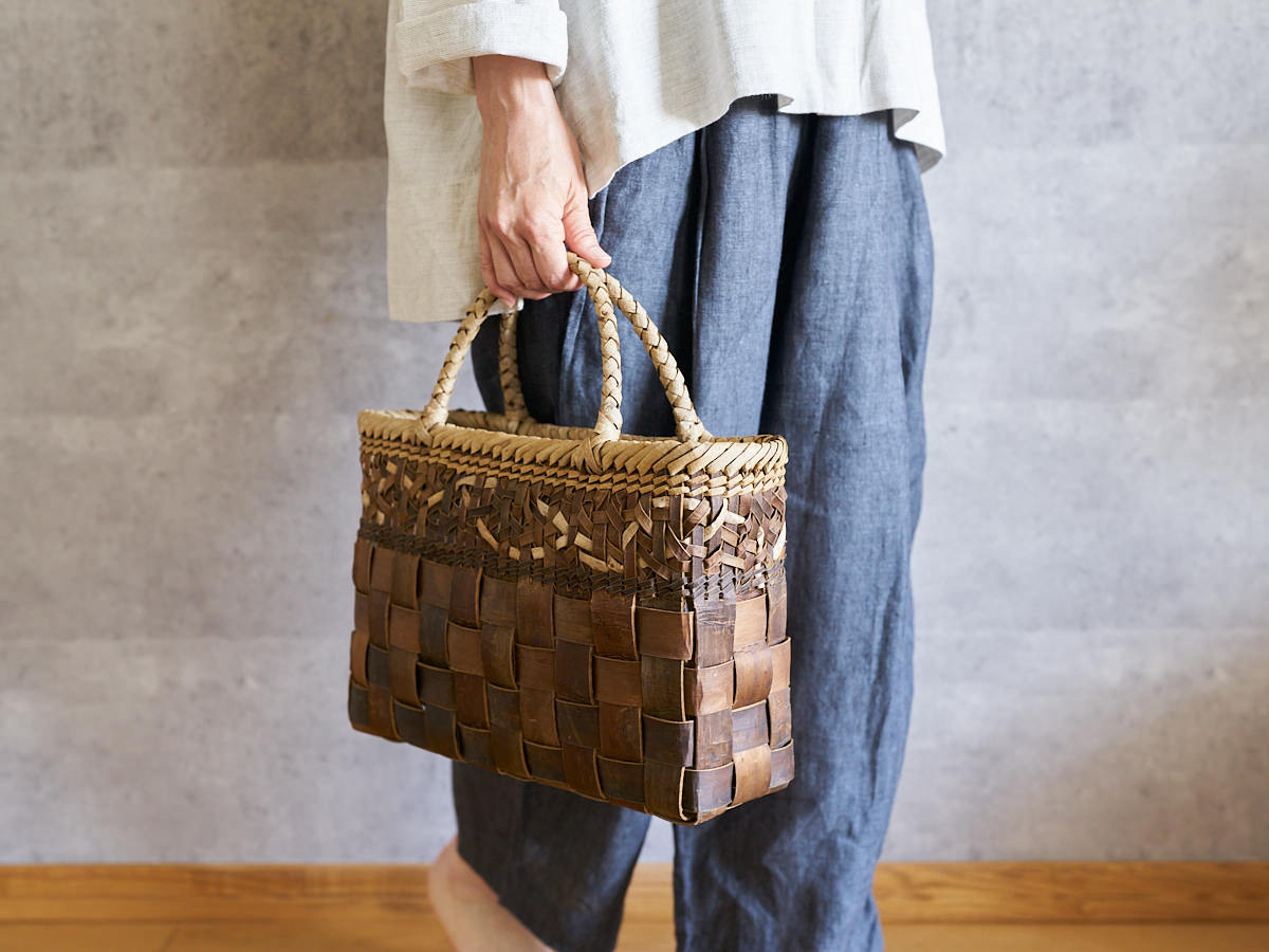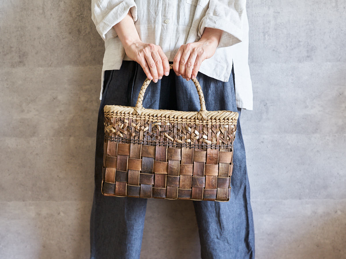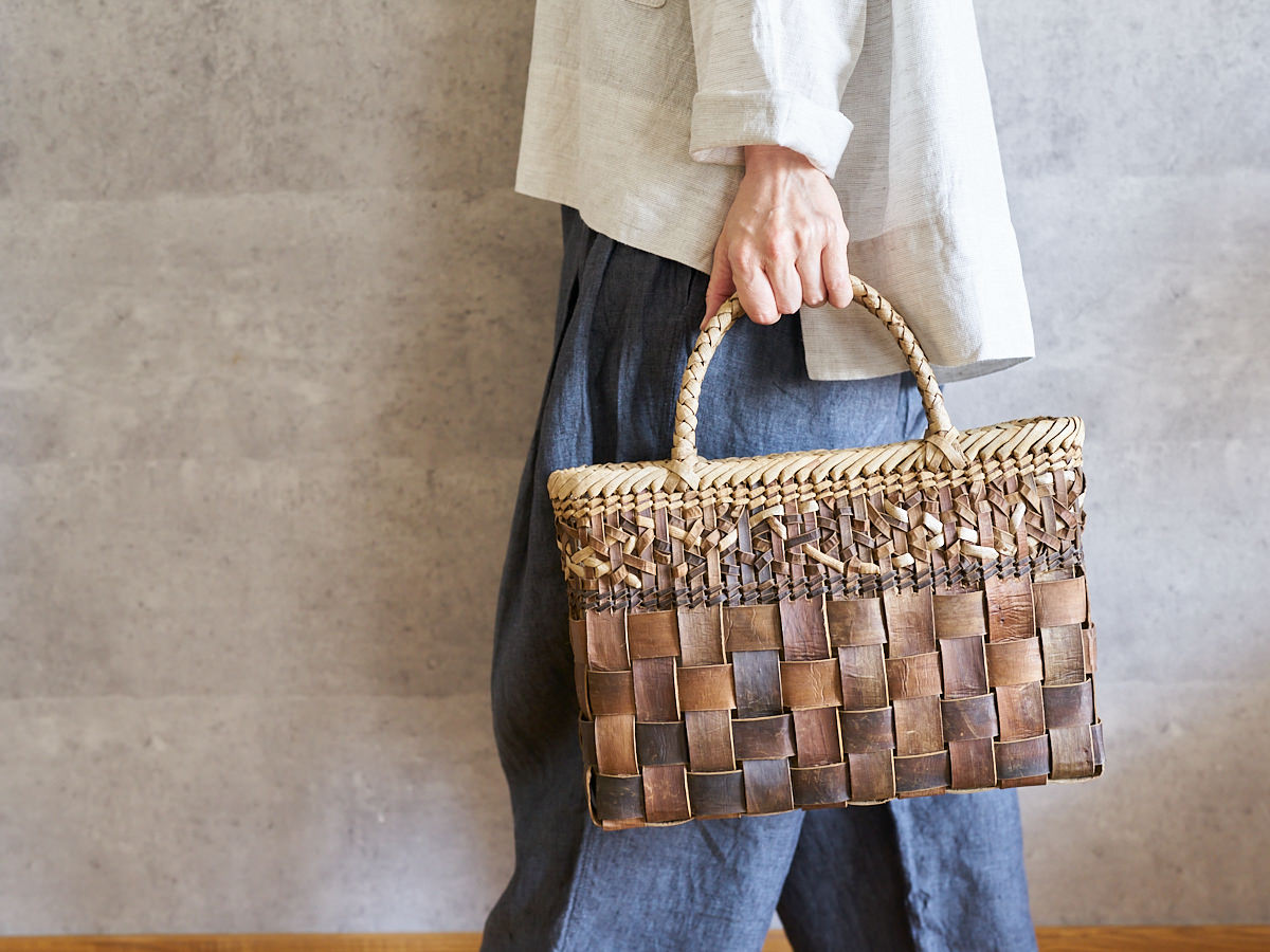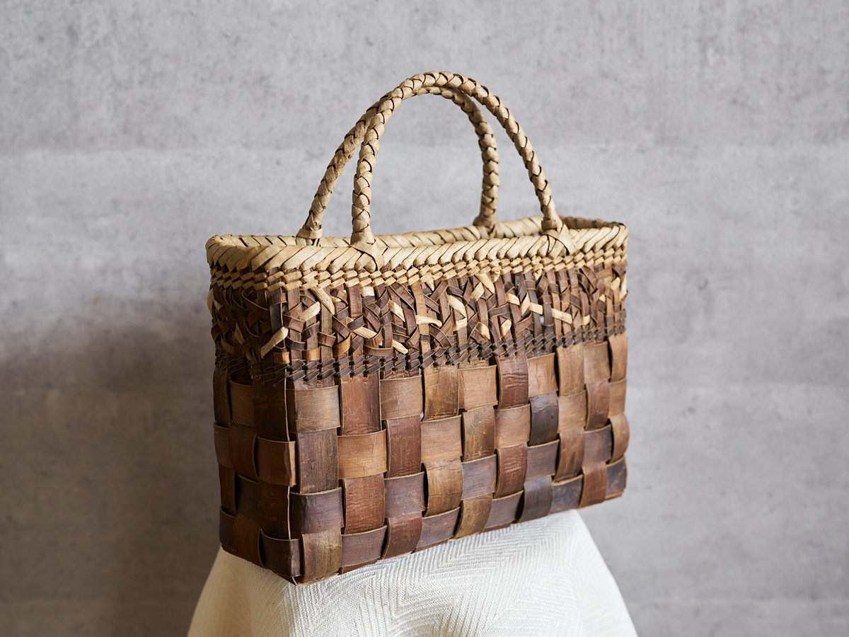 こちらは沢胡桃(さわぐるみ)の樹皮を使って編まれた手提げです。