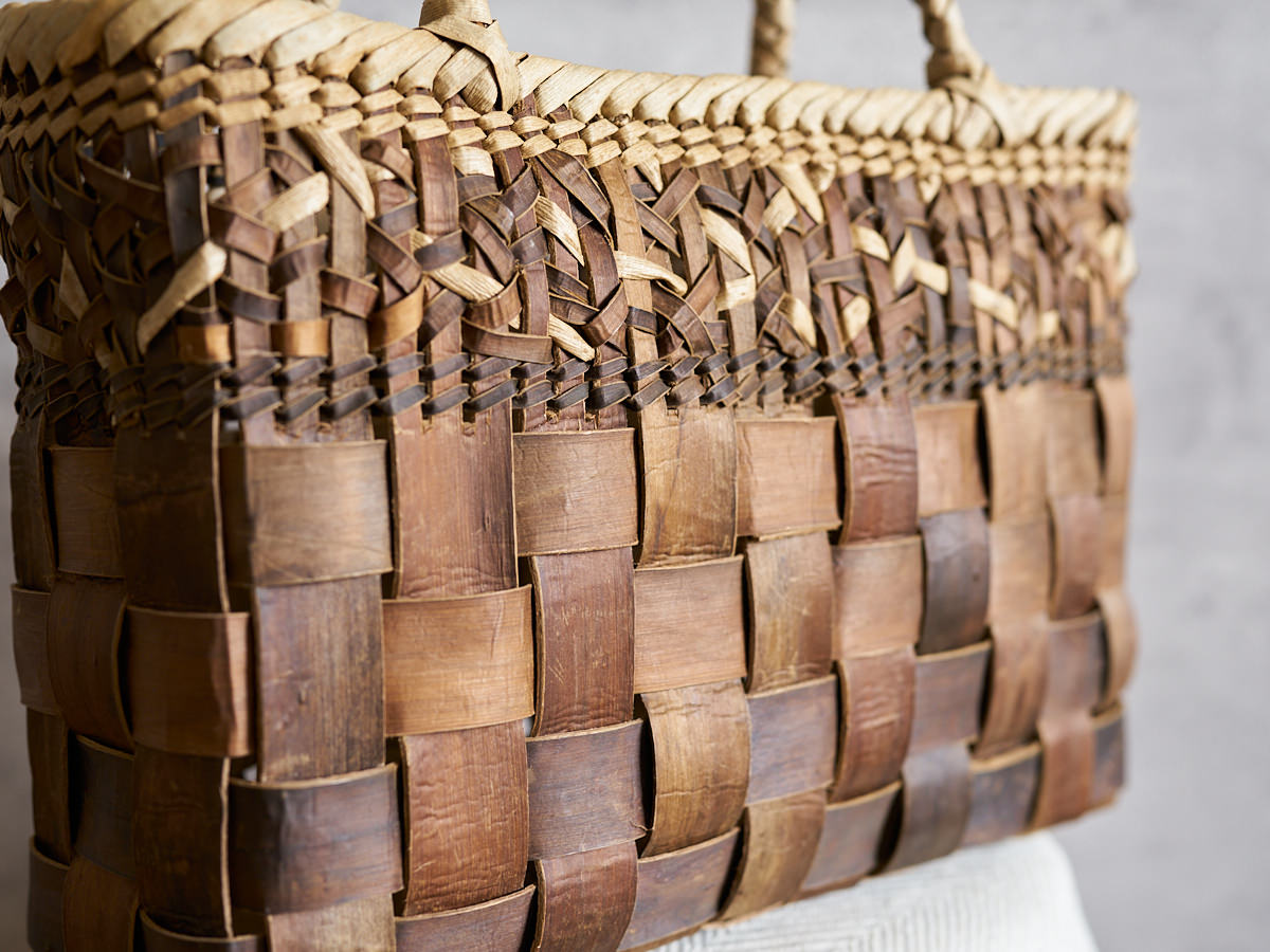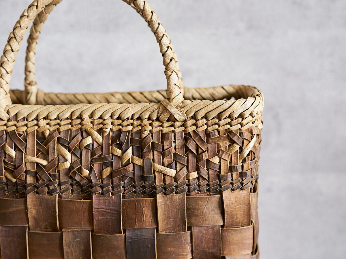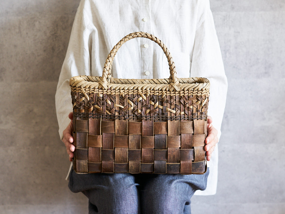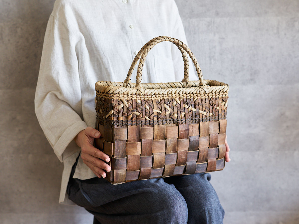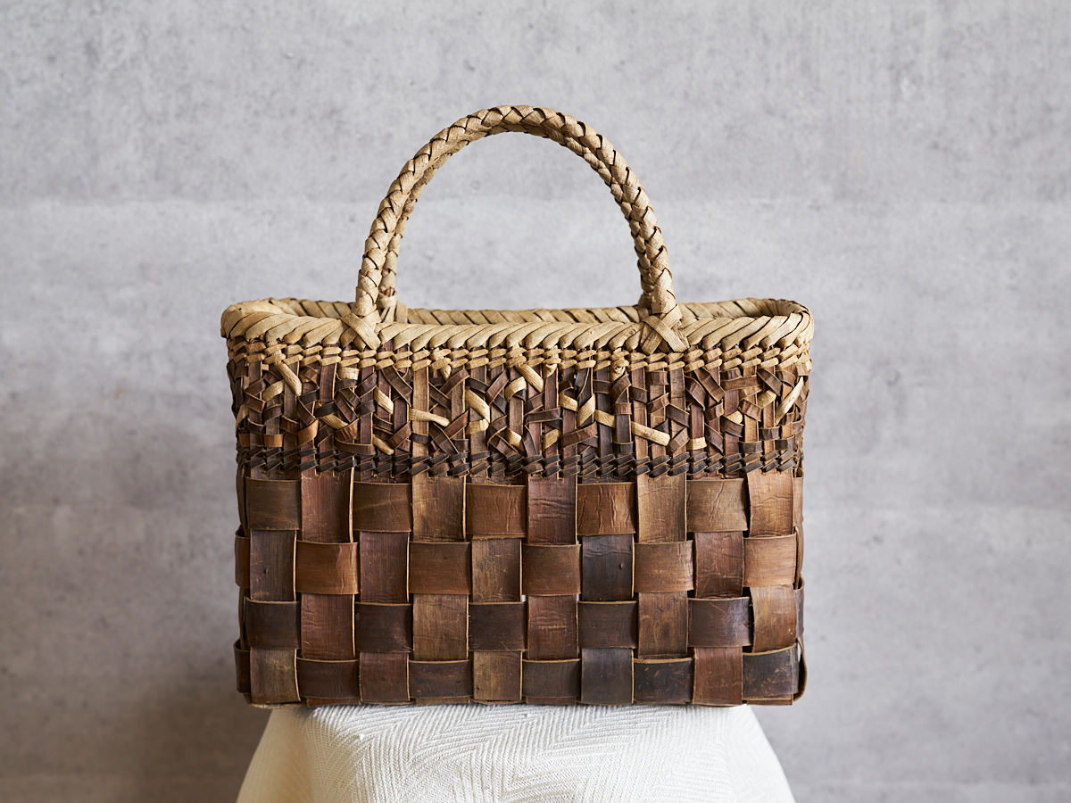 こちらは沢胡桃(さわぐるみ)の樹皮を使って編まれた手提げです。