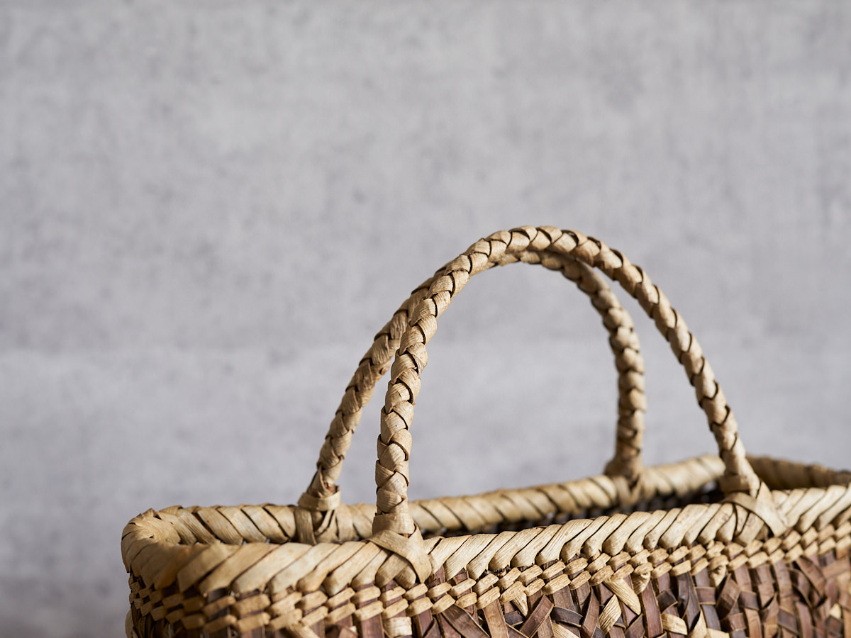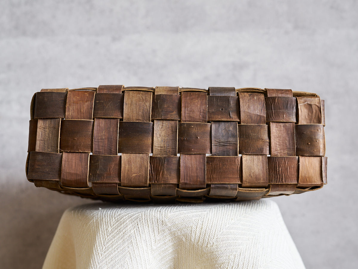 基本的にくるみ樹皮のこげ茶色をした裏皮が表面にくるように編まれています。くるみの樹皮の幅をあえて揃えすぎないことで、その動きのある編み模様が浮かびあがってくるように感じます。その幅広のひごからは、自然界に在ったままの、樹皮の質感や風合いを直に感じられるのも魅力です。