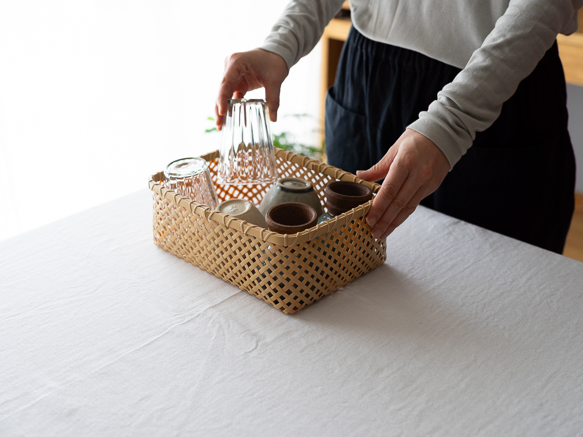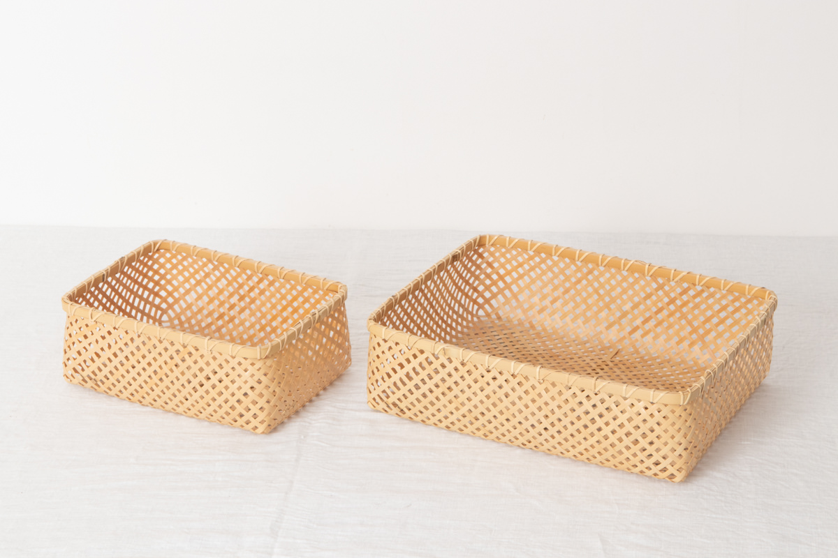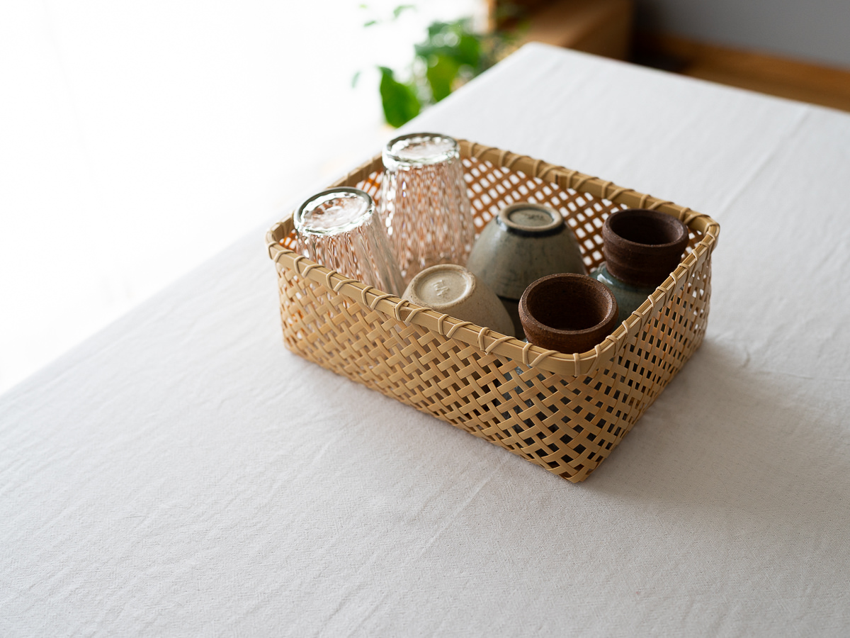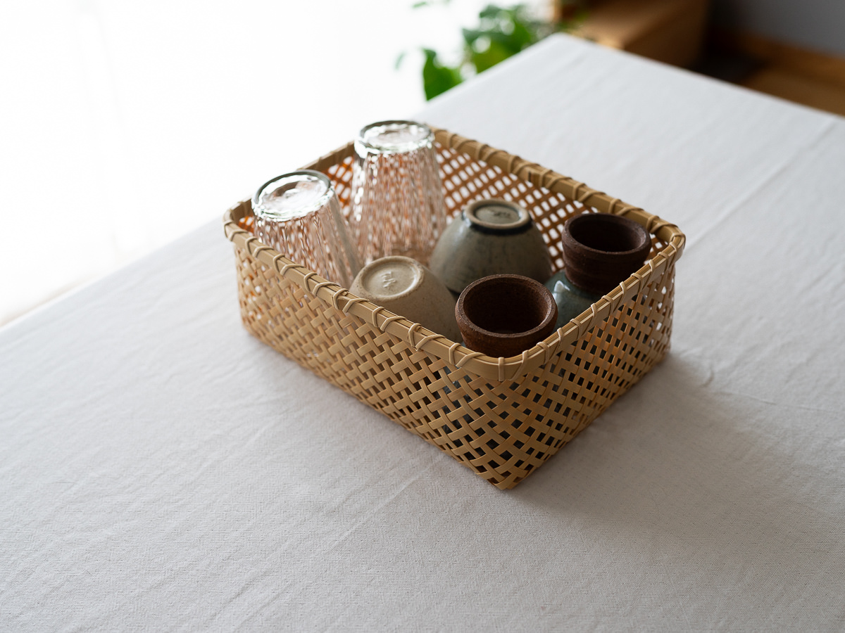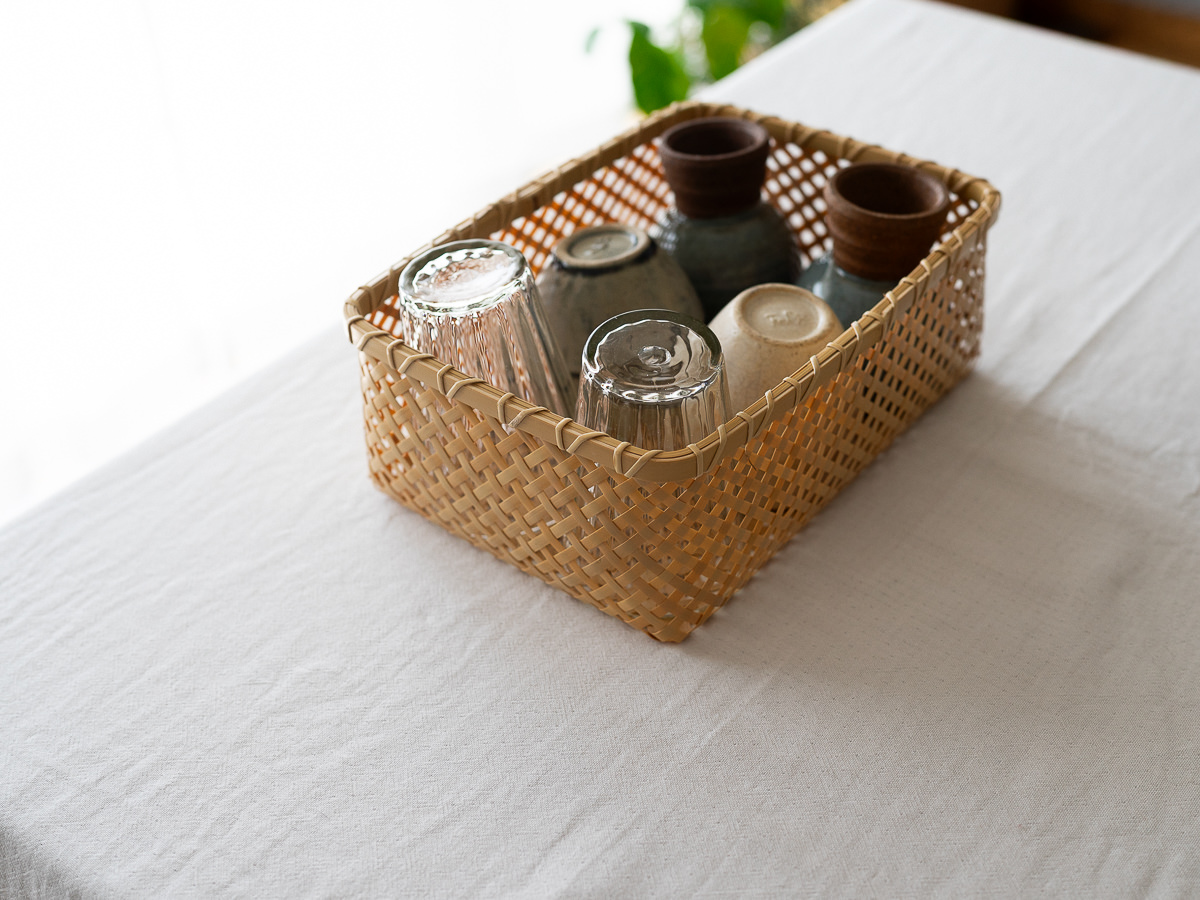 Using this white bamboo, it is finished in hishime-ami (diamond weave), a technique that creates a pattern of diamond-shaped openings.The beauty of the white bamboo skin and the crisp, well-defined weave can be fully appreciated.The rim of the basket is finished by wrapping white bamboo all the way around, then securing it at regular intervals with rattan binding.This is the underside of the basket. Crossed reinforcing bamboo strips (chikara-dake) are set into the base to strengthen the bottom. The darker brown sections of the strips are natural bamboo nodes. These nodes are intentionally positioned on the underside, so that when the basket is viewed from the side, its appearance remains clean and well balanced.However, the two bamboo nodes that would otherwise fall at the sharply angled corners are positioned on the sides rather than the base, to prevent them from breaking.This thoughtful construction reflects careful consideration of the nature of bamboo nodes, which can snap easily, and shows the maker’s intention to ensure the basket remains durable over time.This is the inside of the basket, showing the four corners. They are neatly and carefully finished.Below, we introduce the basket in each size.This is the small size.リビングのカウンターや寝室のベッドサイドなどで、小物をまとめて入れておいたり、It can also be used as a basket for storing cups or glasses. The open weave of the basket and the vessels inside complement each other, creating a clean and balanced impression.It is also a convenient size for gathering bottles such as lotions, body creams, or oils.This is the large size.It works well around the kitchen for storing seasonings, favorite foods, or dried ingredients. It can also be used to organize towels or clothing.The inside of the basket is also carefully finished, with the bamboo strips neatly treated so there is little concern about catching or snagging.