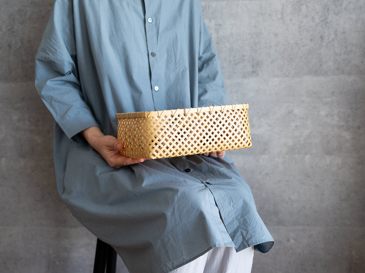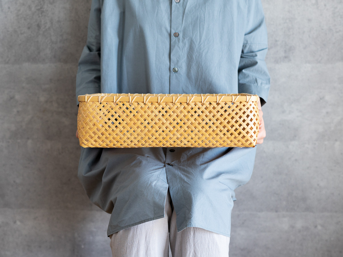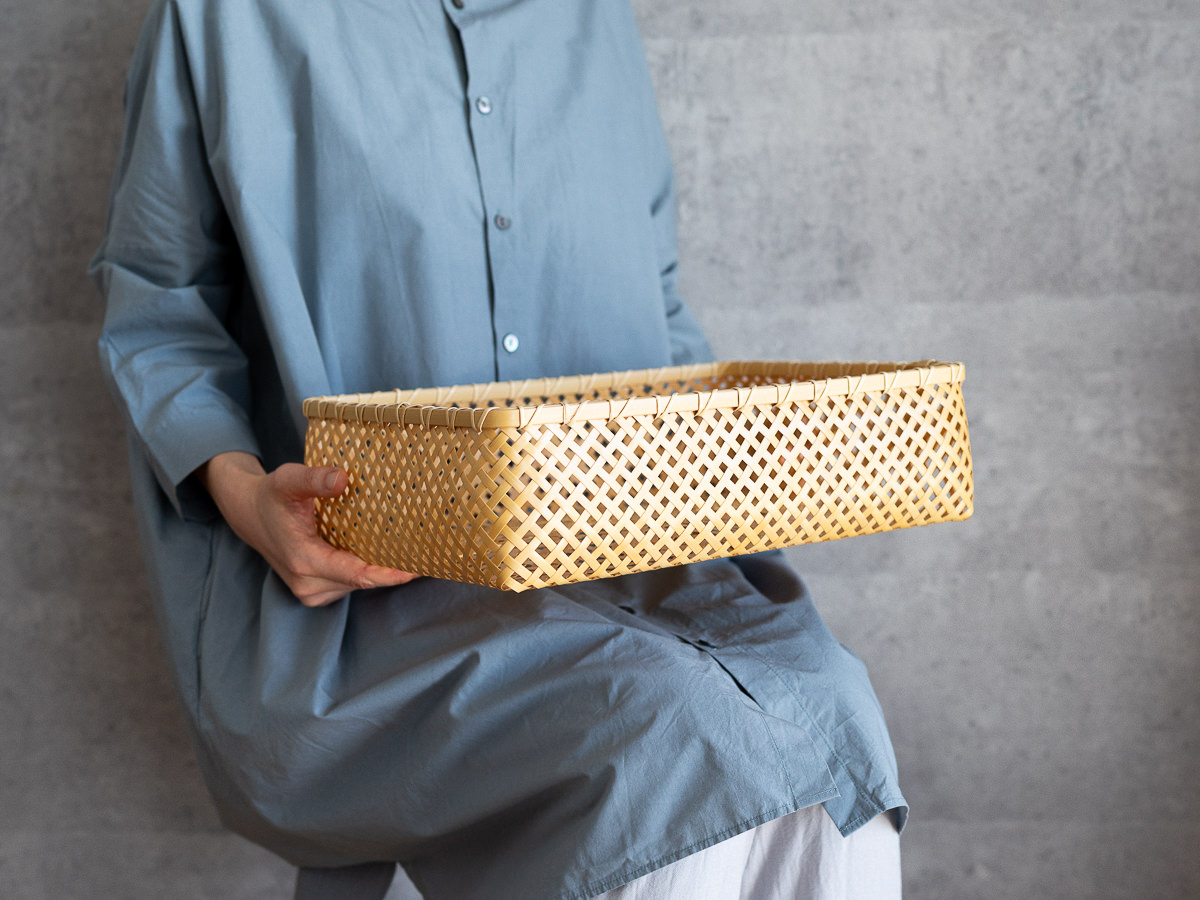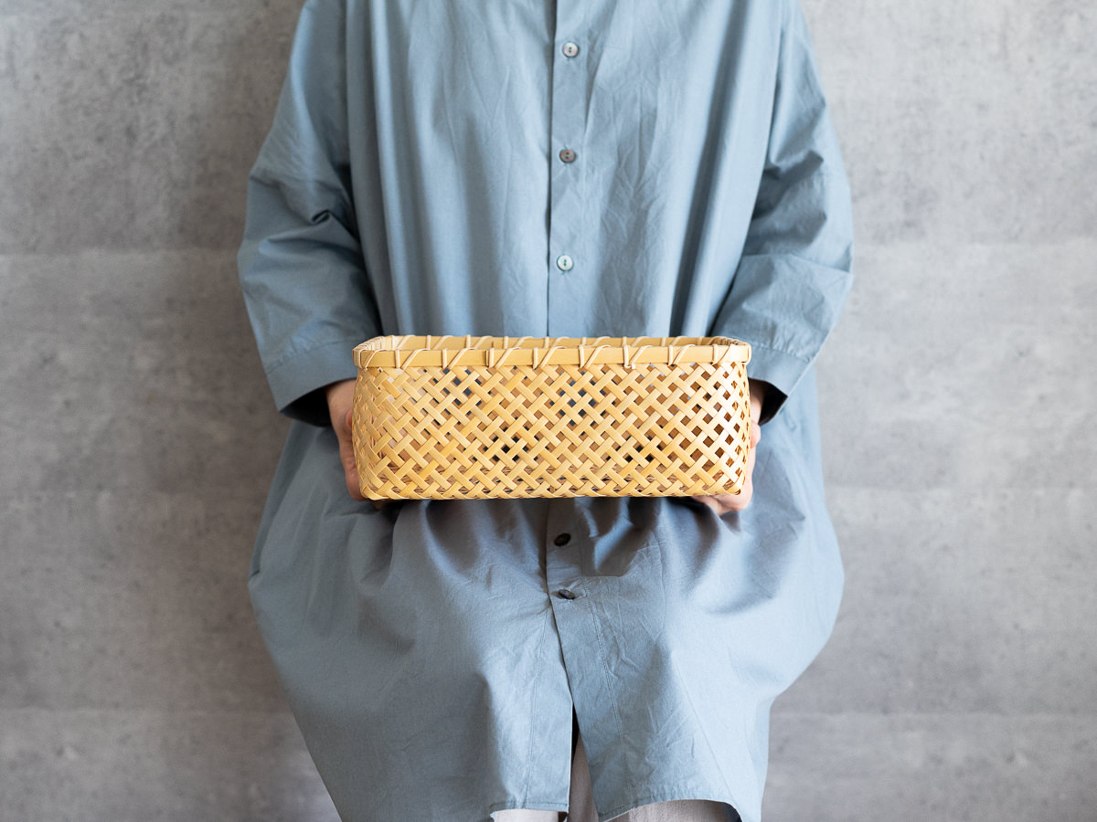 Using this white bamboo, it is finished in hishime-ami (diamond weave), a technique that creates a pattern of diamond-shaped openings.The beauty of the white bamboo skin and the crisp, well-defined weave can be fully appreciated.The rim of the basket is finished by wrapping white bamboo all the way around, then securing it at regular intervals with rattan binding.This is the underside of the basket. Crossed reinforcing bamboo strips (chikara-dake) are set into the base to strengthen the bottom. The darker brown sections of the strips are natural bamboo nodes. These nodes are intentionally positioned on the underside, so that when the basket is viewed from the side, its appearance remains clean and well balanced.However, the two bamboo nodes that would otherwise fall at the sharply angled corners are positioned on the sides rather than the base, to prevent them from breaking.This thoughtful construction reflects careful consideration of the nature of bamboo nodes, which can snap easily, and shows the maker’s intention to ensure the basket remains durable over time.This is the inside of the basket, showing the four corners. They are neatly and carefully finished.Below, we introduce the basket in each size.This is the small size.リビングのカウンターや寝室のベッドサイドなどで、小物をまとめて入れておいたり、It can also be used as a basket for storing cups or glasses. The open weave of the basket and the vessels inside complement each other, creating a clean and balanced impression.It is also a convenient size for gathering bottles such as lotions, body creams, or oils.This is the large size.It works well around the kitchen for storing seasonings, favorite foods, or dried ingredients. It can also be used to organize towels or clothing.The inside of the basket is also carefully finished, with the bamboo strips neatly treated so there is little concern about catching or snagging.