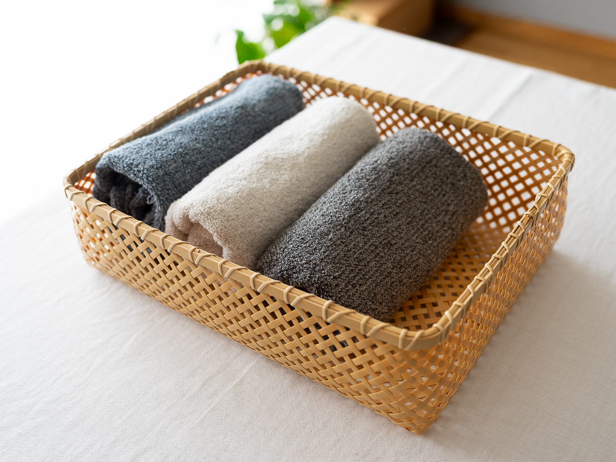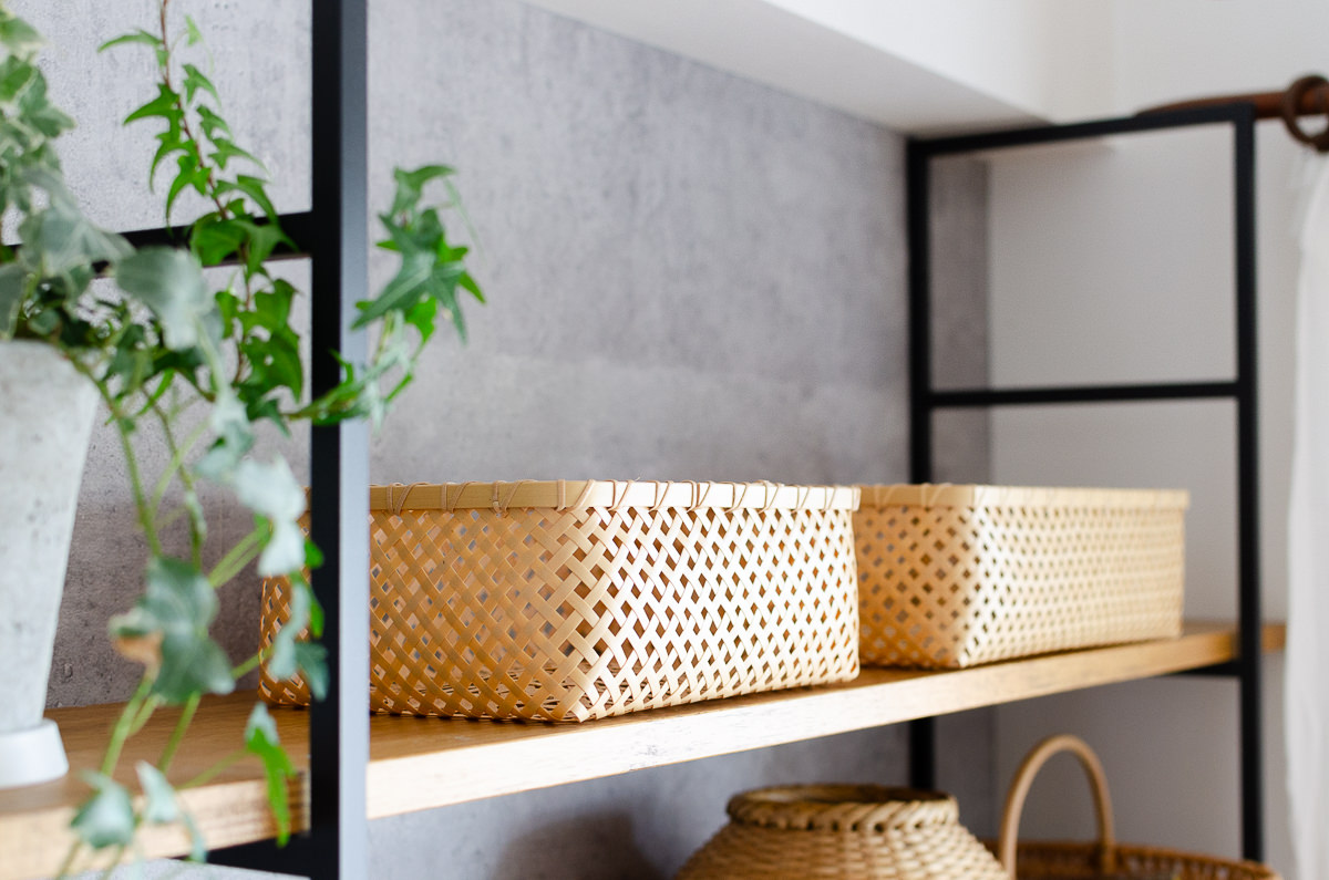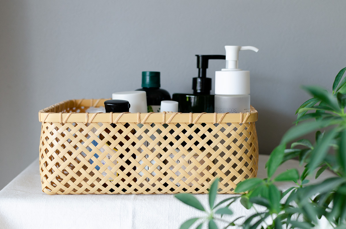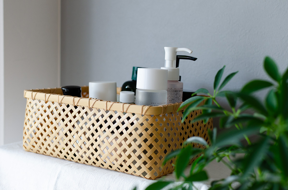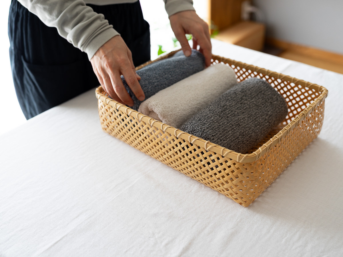 Using this white bamboo, it is finished in hishime-ami (diamond weave), a technique that creates a pattern of diamond-shaped openings.The beauty of the white bamboo skin and the crisp, well-defined weave can be fully appreciated.The rim of the basket is finished by wrapping white bamboo all the way around, then securing it at regular intervals with rattan binding.This is the underside of the basket. Crossed reinforcing bamboo strips (chikara-dake) are set into the base to strengthen the bottom. The darker brown sections of the strips are natural bamboo nodes. These nodes are intentionally positioned on the underside, so that when the basket is viewed from the side, its appearance remains clean and well balanced.However, the two bamboo nodes that would otherwise fall at the sharply angled corners are positioned on the sides rather than the base, to prevent them from breaking.This thoughtful construction reflects careful consideration of the nature of bamboo nodes, which can snap easily, and shows the maker’s intention to ensure the basket remains durable over time.This is the inside of the basket, showing the four corners. They are neatly and carefully finished.Below, we introduce the basket in each size.This is the small size.リビングのカウンターや寝室のベッドサイドなどで、小物をまとめて入れておいたり、It can also be used as a basket for storing cups or glasses. The open weave of the basket and the vessels inside complement each other, creating a clean and balanced impression.It is also a convenient size for gathering bottles such as lotions, body creams, or oils.This is the large size.It works well around the kitchen for storing seasonings, favorite foods, or dried ingredients. It can also be used to organize towels or clothing.The inside of the basket is also carefully finished, with the bamboo strips neatly treated so there is little concern about catching or snagging.