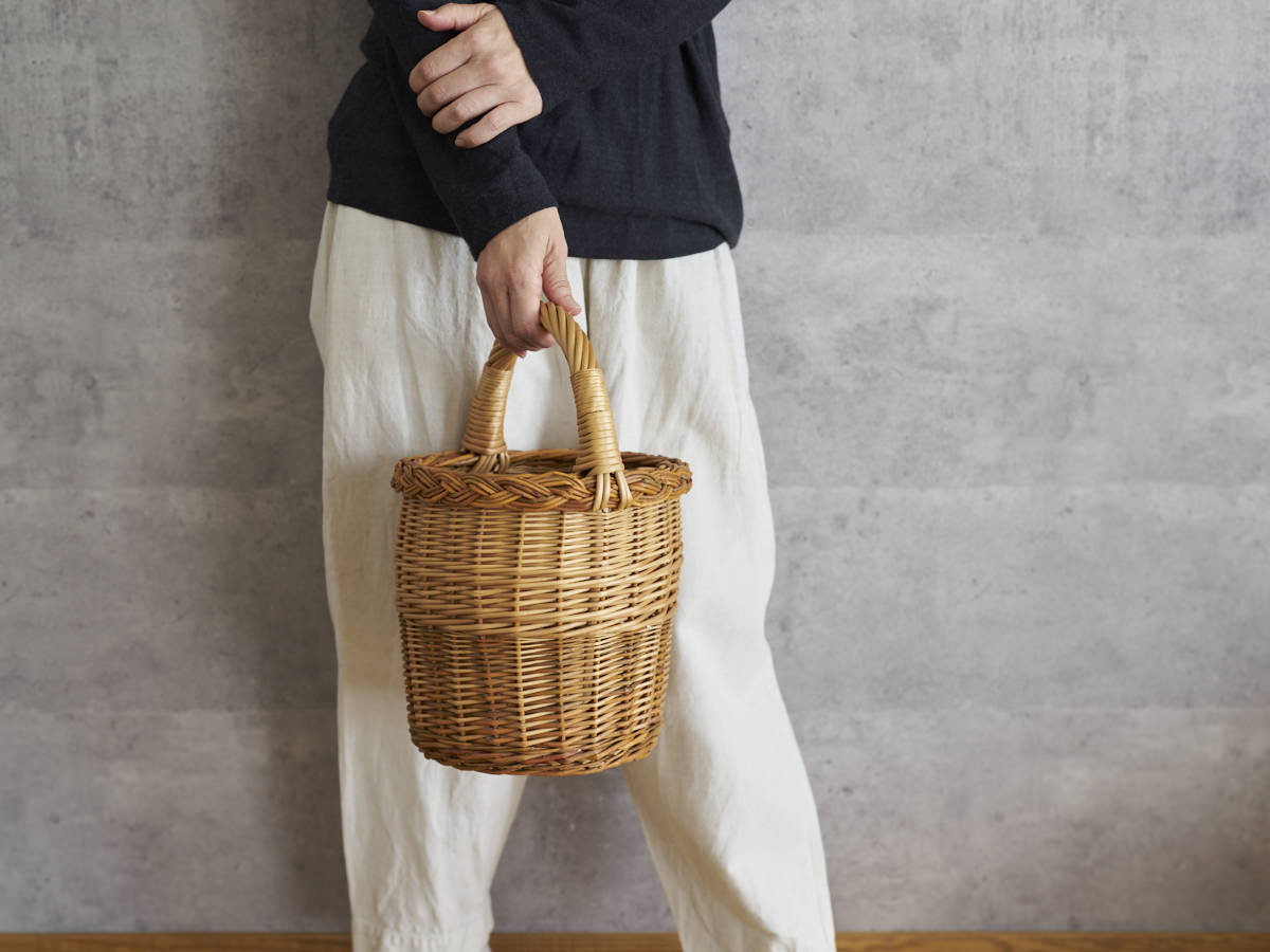 Its tall, slender silhouette makes it a convenient size for outings by train or bus. Depending on the season, placing a cloth or handkerchief over the top as a cover is also recommended.It also works well as a basket for everyday groceries or bread. Unlike soft bags, the items inside stay in place, making it suitable for carrying delicate foods. Thanks to its tall height, it is also convenient for bringing home or storing bottles of beverages or wine.