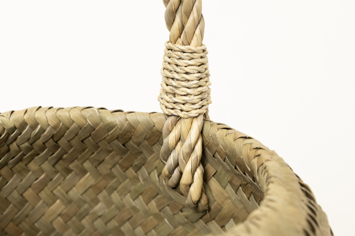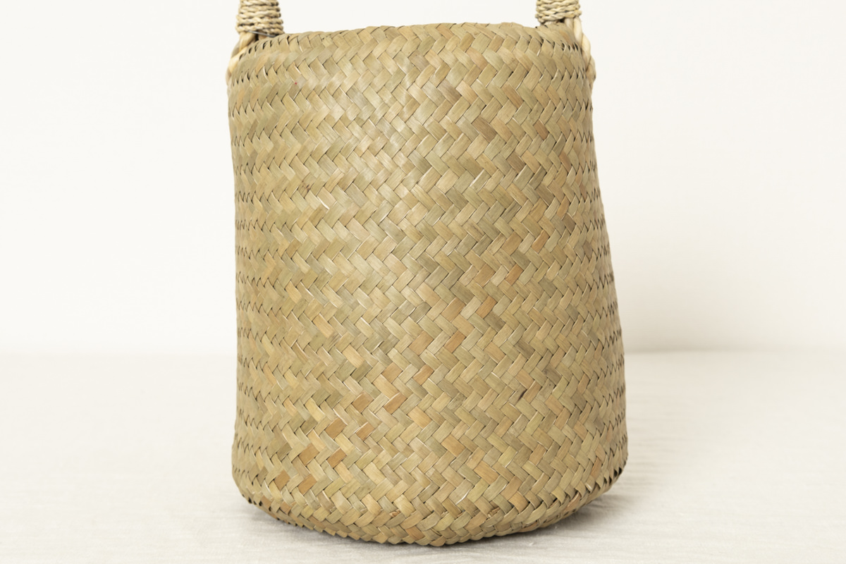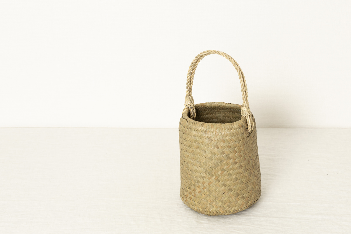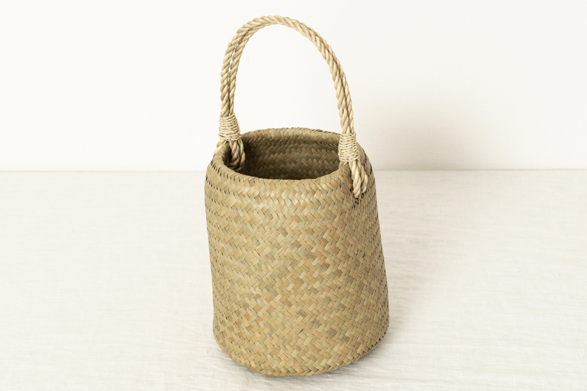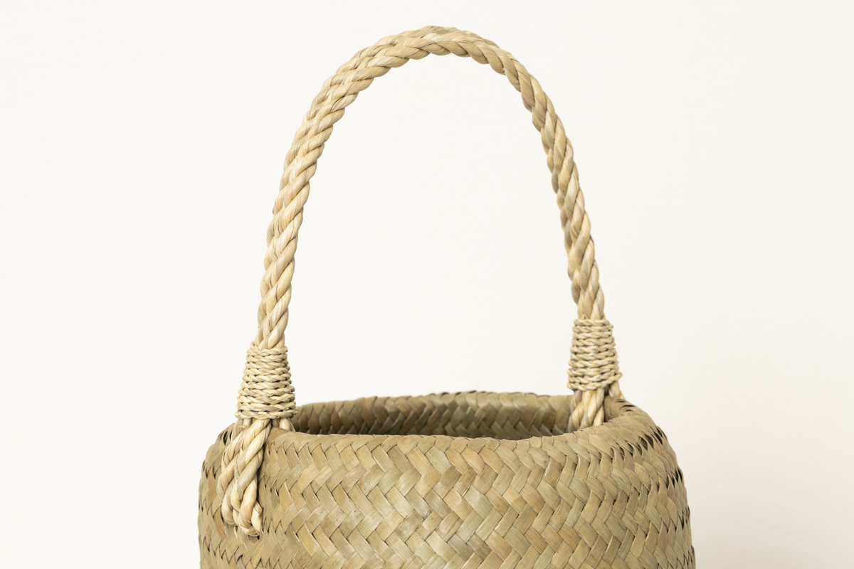 The basket is made with a tightly woven structure.Flattened stems are interwoven in an alternating pattern to form a mat-like piece, which is then shaped into a basket.The rim is finished with a clean and simple appearance.This is the rim as seen from the inside of the basket. At this edge, the weave is folded back.From above, you can see how neatly and smoothly it is finished.The base is made separately from the sides. As you can see, the pattern also differs.The base is very sturdy, giving a reassuring sense of stability.This is the joint between the handle and the basket. The braided handle is threaded through the woven structure of the Krajood.Although it is a single-handle design, the handle is made by bundling two ropes together, providing a stable and secure feel. You can use it with confidence, without concern that the rope will easily break.The handle is made from a plant called “Kok” in Thai, a type of sedge. It is twisted into a rope-like form and used for the handle.As a final step in the making process, the entire surface of the basket is coated with a starch-based adhesive. This is an essential process that helps strengthen the Krajood basket.At times, you may notice stain-like discoloration on the strips as shown here. We hope you will understand this as part of the natural character of the material.A size that sits comfortably on the lap. Its tall, vertical silhouette gives it a clean and streamlined appearance.As the shape gently tapers toward the opening, it is easy to use even on trains or buses without worrying too much about the space around you.Well suited for a stroll or a short outing. It can hold a wallet, smartphone, and pouch, as well as a small water bottle with a bit of height.Suitable for outings as well as commuting. It is a versatile size that works well for a wide range of uses.