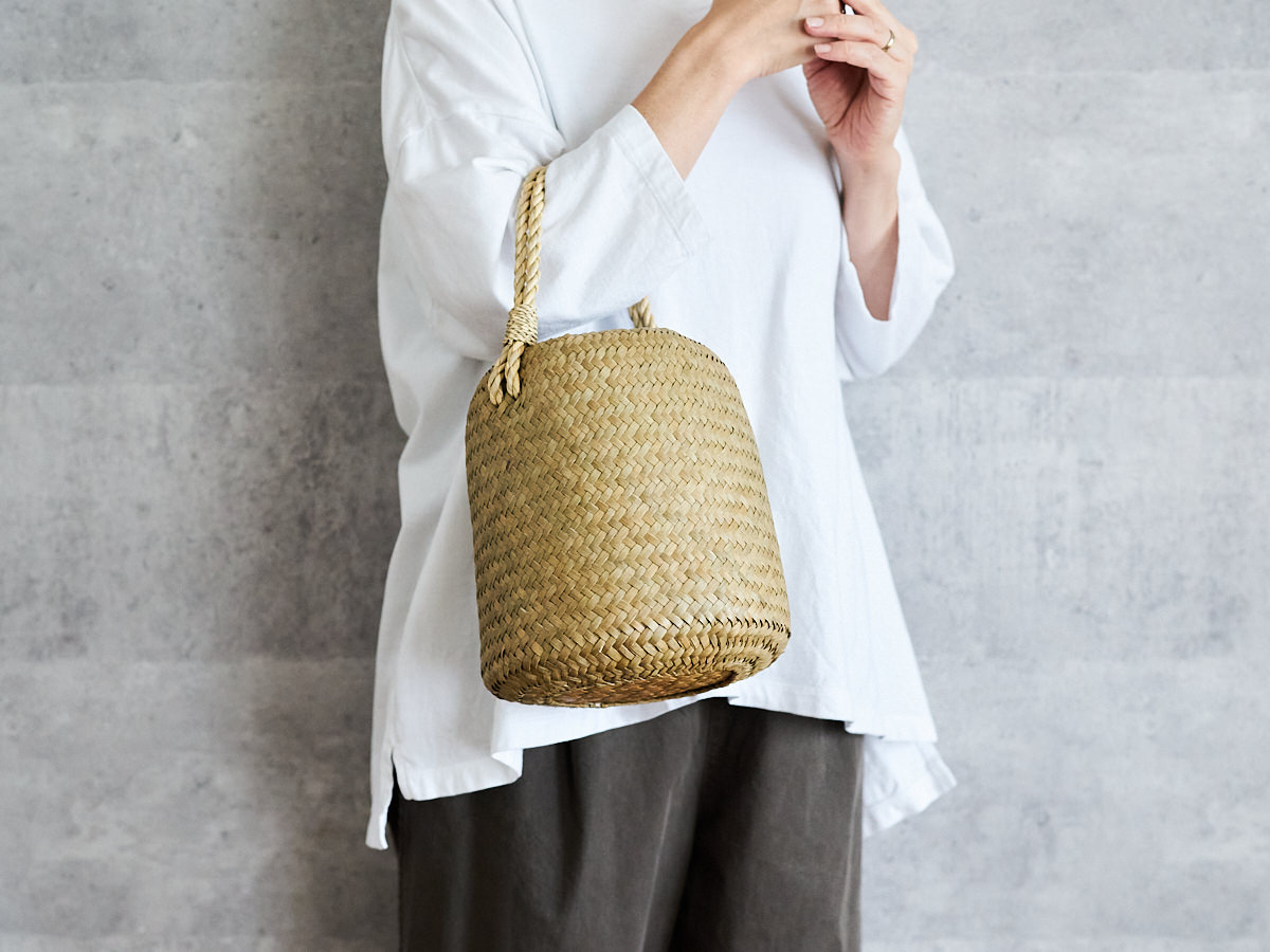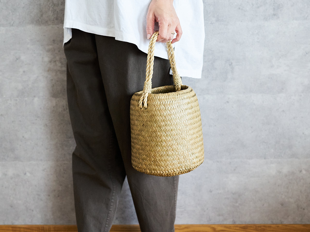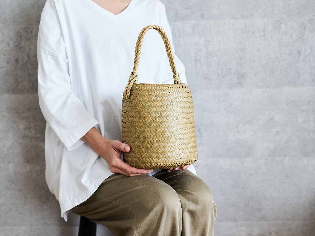 On this page, we introduce a cylindrical basket bag made from Krajood, finished with a double-woven structure.