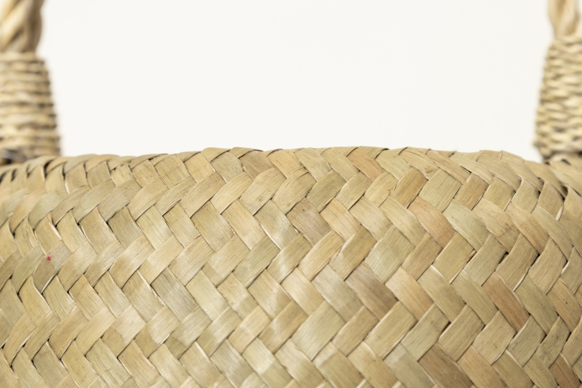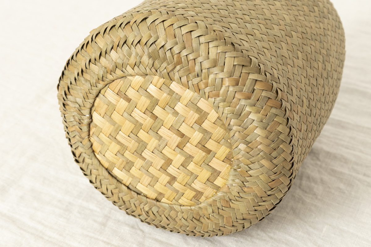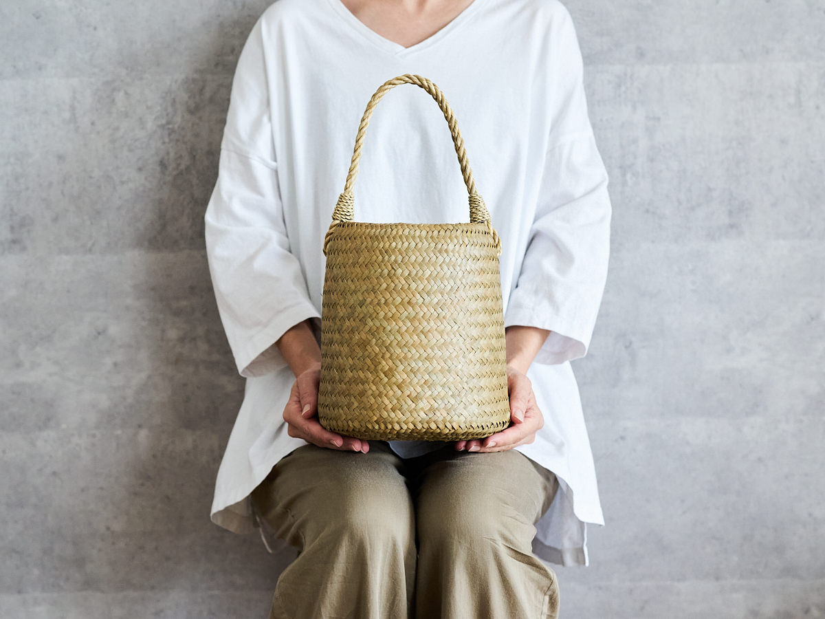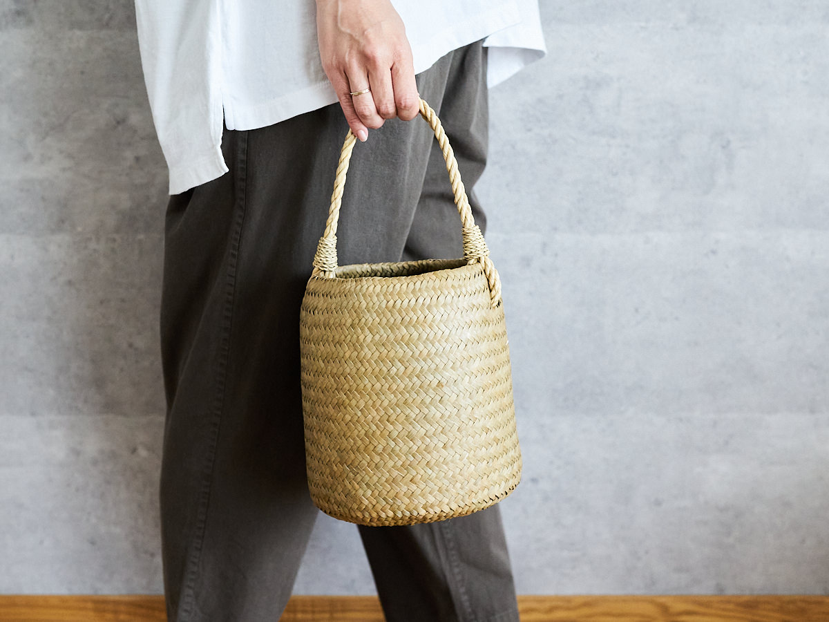 On this page, we introduce a cylindrical basket bag made from Krajood, finished with a double-woven structure.