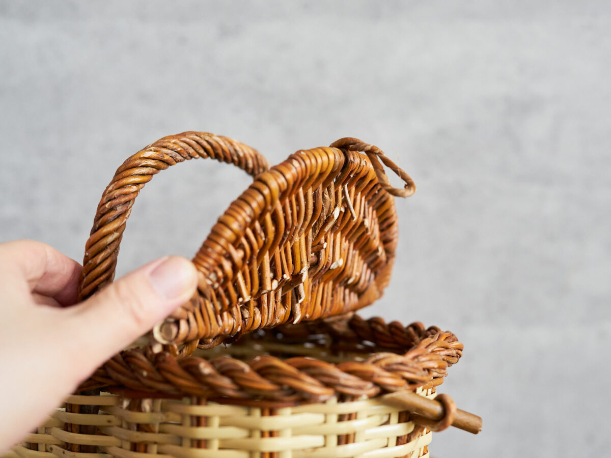 持ち手は太いやなぎを芯材にして、その上からほそいやなぎの枝を巻きつけています。縦骨や縁巻きの枝をそのまま利用するため、こちらも抜けるような心配がまったくありません。