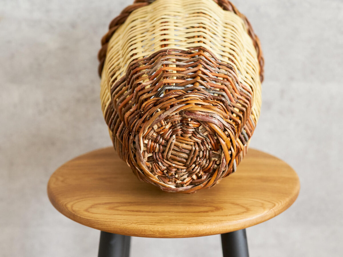 持ち手は太いやなぎを芯材にして、その上からほそいやなぎの枝を巻きつけています。縦骨や縁巻きの枝をそのまま利用するため、こちらも抜けるような心配がまったくありません。